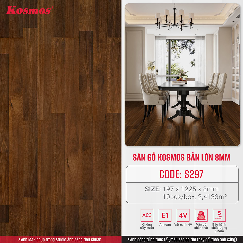 Sàn gỗ Kosmos S297 là sản phẩm chất lượng của bộ sưu tập sàn gỗ Kosmos 8mm bản lớn thuộc tổng kho Kosmos Việt Nam. Đây là lựa chọn lý tưởng cho những người đang tìm kiếm một sản phẩm sàn gỗ vừa đẹp vừa bền.