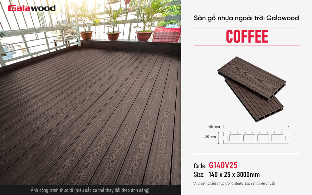 Sàn gỗ nhựa ngoài trời Galawood G140V25 Coffee (nâu cà phê) là vật liệu được sản xuất bằng công nghệ ép đùn hiện đại với thành phần chính là bột gỗ và bột nhựa.