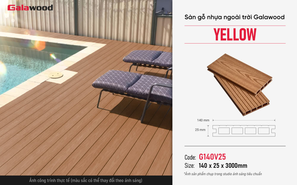 Sàn gỗ nhựa ngoài trời lỗ vuông vân gỗ 2D mã G140V25 màu Yellow (vàng) thương hiệu Galawood