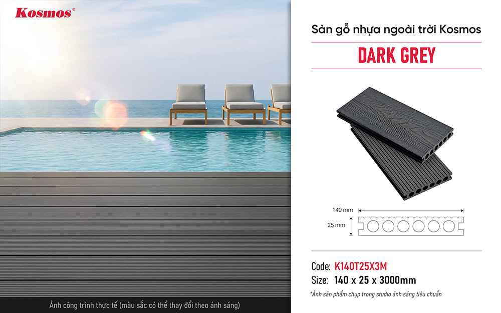 Sàn gỗ nhựa ngoài trời 1 lớp Dark Grey màu xám đậm vân gỗ 3D K140T25X3M Kosmos có tuổi thọ 10 năm, bảo hành 3 năm. Sản phẩm chống chịu thời tiết tốt, chịu nước và chống mối hiệu quả. Sàn ứng dụng trong 4 khu vực ngoài trời chính: hồ bơi, ban công, sân thượng và sân vườn.