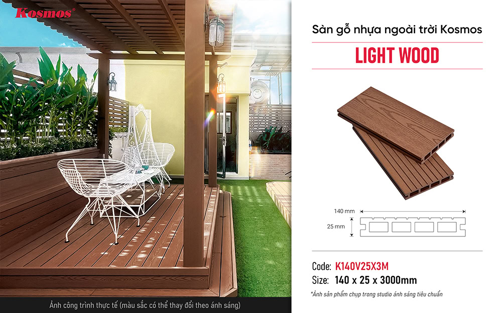 Sàn gỗ nhựa 1 lớp Light Wood vân gỗ 2D K140V25X3M/2.2M của Kosmos được sản xuất trên dây chuyền công nghệ hiện đại, đảm bảo chất lượng và độ bền cao. Sản phẩm đã góp mặt trên hơn 1000 công trình sàn ngoài trời khắp cả nước.
