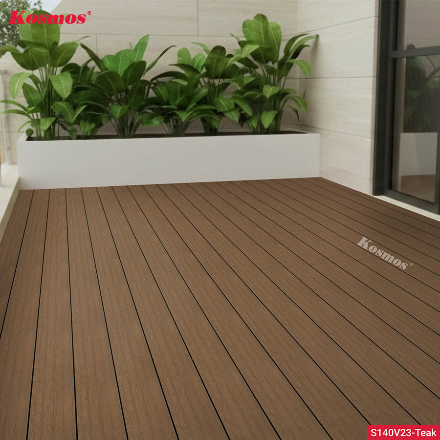 Sàn gỗ nhựa 2 da S140V23 màu Teak được thiết kế với kích thước tối ưu 140mm x 23mm x 3000mm, tạo diện tích phủ 0,42m²/thanh, giúp giảm thiểu 15-20% hao phí trong quá trình thi công so với các kích thước truyền thống.