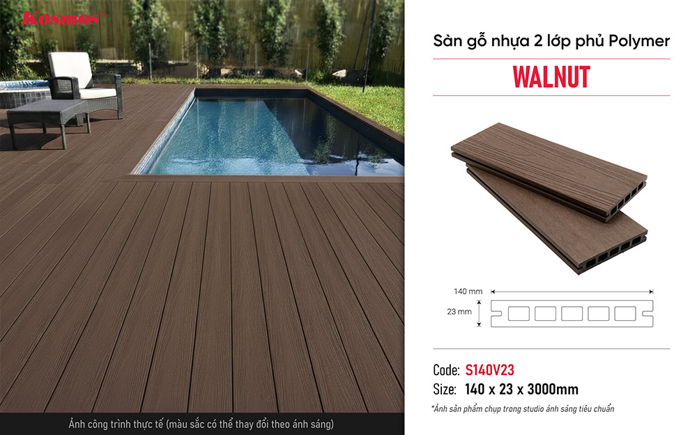 Sàn gỗ nhựa thế hệ mới phủ Polymer mã S140V23 màu Walnut đại diện cho bước tiến vượt bậc trong công nghệ vật liệu Composite ngoài trời, kết hợp hoàn hảo giữa vẻ đẹp sang trọng của gỗ tự nhiên và độ bền lâu dài của nhựa. Với cấu tạo đặc biệt, thông số kỹ thuật ấn tượng và khả năng chống chịu môi trường khắc nghiệt, sản phẩm mang đến giải pháp toàn diện cho mọi không gian ngoại thất từ hồ bơi, ban công đến sân vườn cao cấp.