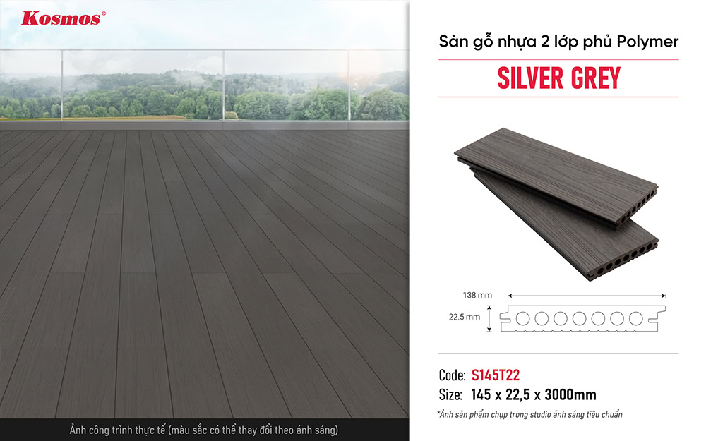 Sàn gỗ nhựa 2 da Kosmos mã S145T22 Silver Grey có nhiều ưu điểm phù hợp với các không gian ngoại thất.