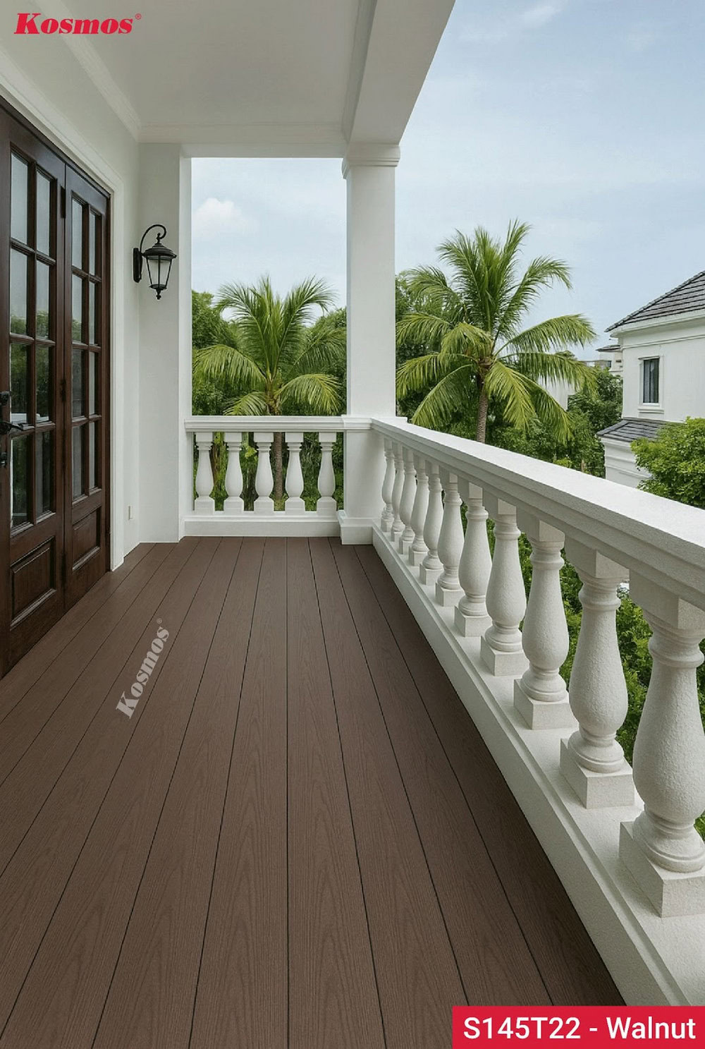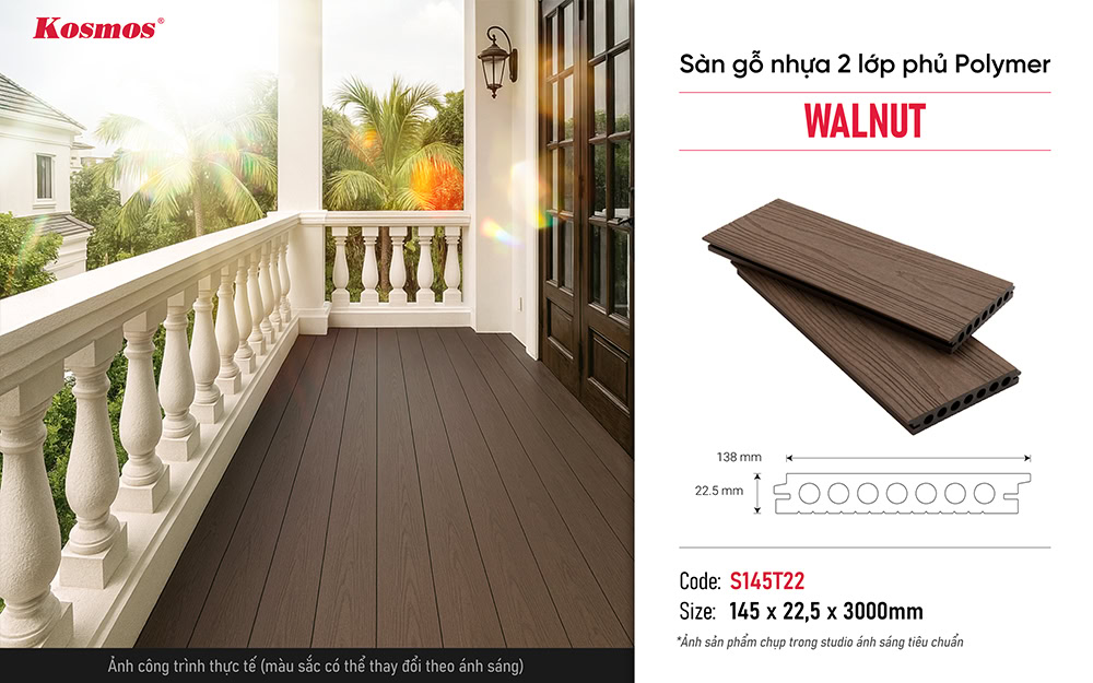 Sàn gỗ nhựa 2 da mã S145T22 màu Walnut là loại vật liệu composite gỗ-nhựa thế hệ mới, được sản xuất với một lớp lõi WPC truyền thống (chịu lực, chống mối mọt) và một lớp vỏ bọc bên ngoài được cấu tạo từ Polymer. Sản phẩm có màu Walnut với cấu trúc 7 lỗ tròn, phổ biến trong nhiều hạng mục lót sàn hồ bơi, ban công, sân thượng, sân vườn ngoài trời.
