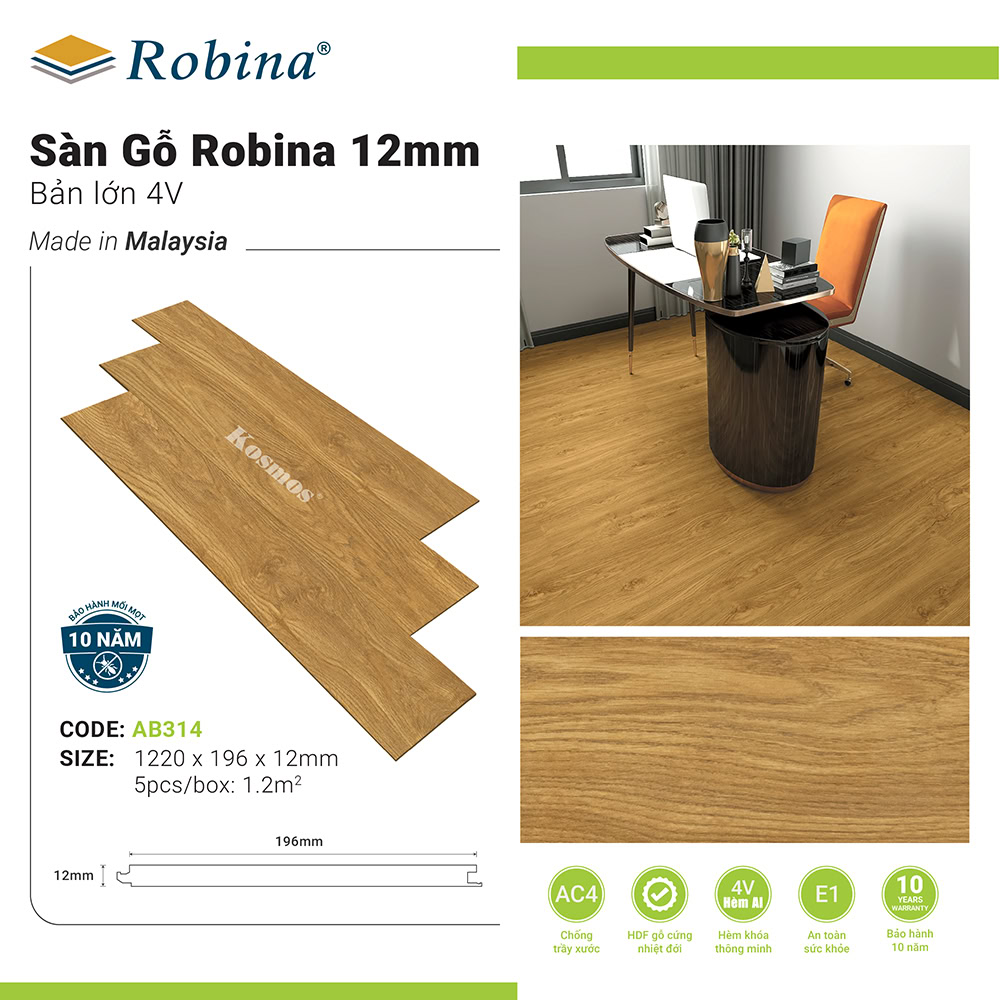 Với gam màu vàng sồi đậm cổ điển, kết hợp cùng độ bền vượt trội, sàn gỗ Robina 12mm bản lớn AB314 chắc chắn là sự lựa chọn lý tưởng cho nhiều công trình nội thất. Chính sách bảo hành mối mọt 10 năm càng khẳng định chất lượng của sản phẩm nhập khẩu từ Malaysia.