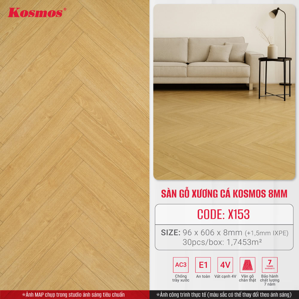 Sàn gỗ xương cá Kosmos X153 (IXPE) dày 8mm màu vàng sồi nhạt
