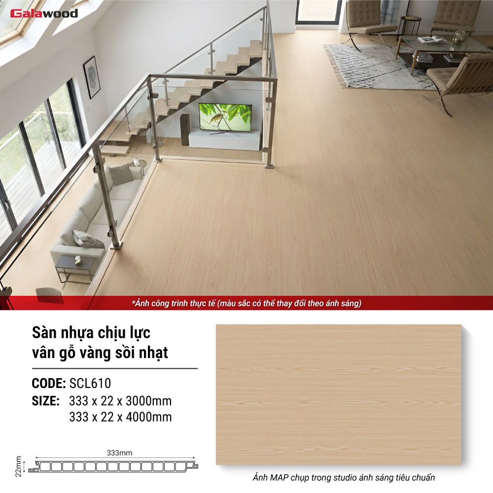 Tấm nhựa lót sàn gác lửng Galawood SCL610 với tông màu vân gỗ vàng sồi nhạt là một kết hợp hoàn hảo giữa vẻ đẹp thẩm mỹ tinh tế và độ bền kết cấu vượt trội. Sản phẩm này không chỉ đáp ứng các tiêu chuẩn khắt khe về chất lượng mà còn là lựa chọn lý tưởng để kiến tạo nên những không gian sống sang trọng, thoáng đãng.