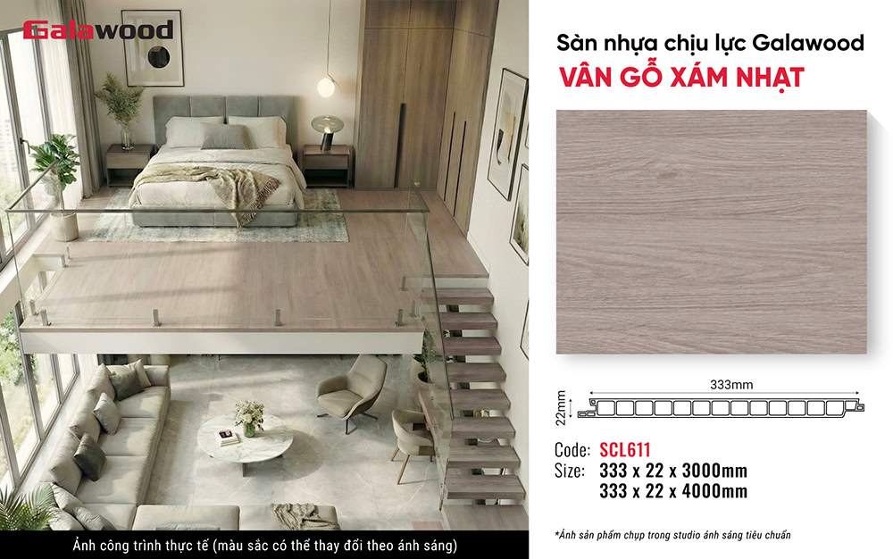 Tấm nhựa lót sàn gác lửng Galawood SCL611 – vân gỗ xám nhạt, chịu tải 500kg/m²