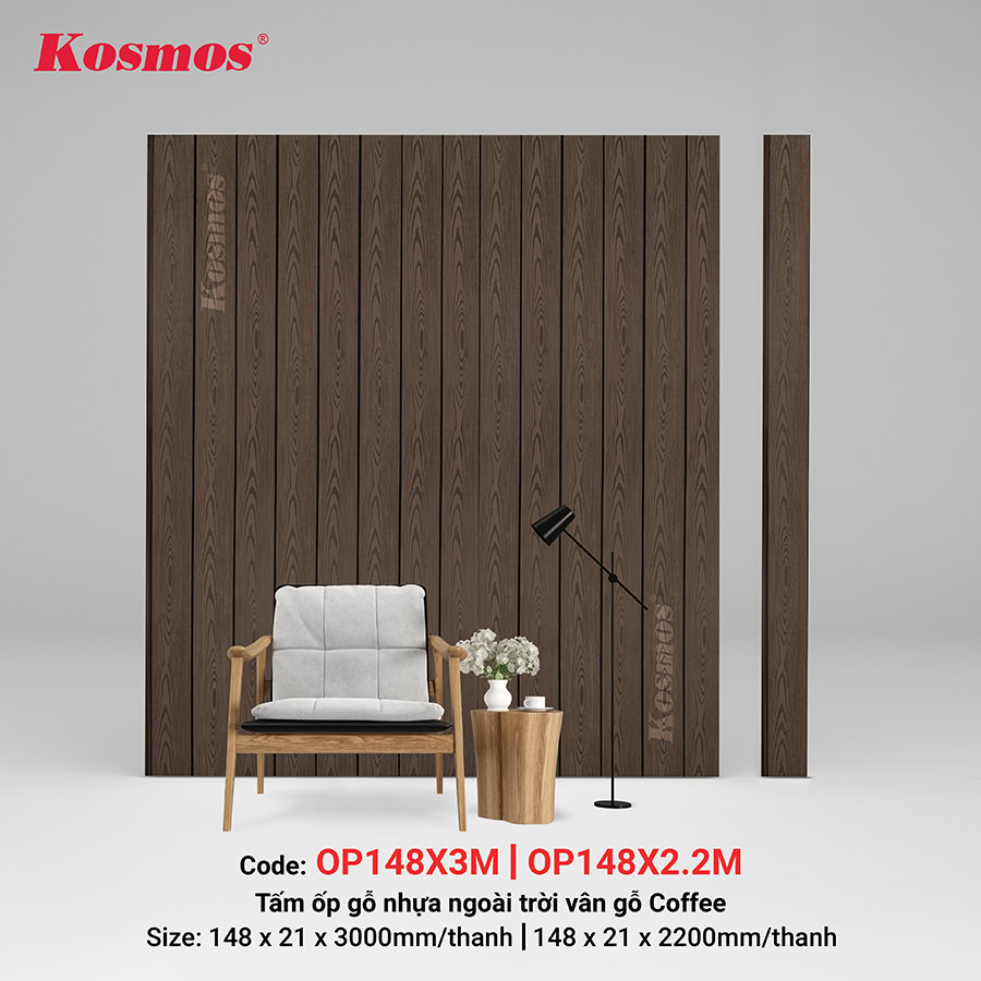 Tấm ốp gỗ nhựa ngoài trời vân gỗ 2D OP148X3M/2.2M Coffee là dòng tấm ốp gỗ nhựa biên dạng phẳng thương hiệu Kosmos được cấu tạo từ 60% bột gỗ, 30% nhựa HDPE và 10% chất phụ gia chuyên dùng trang trí các không gian ngoài trời.