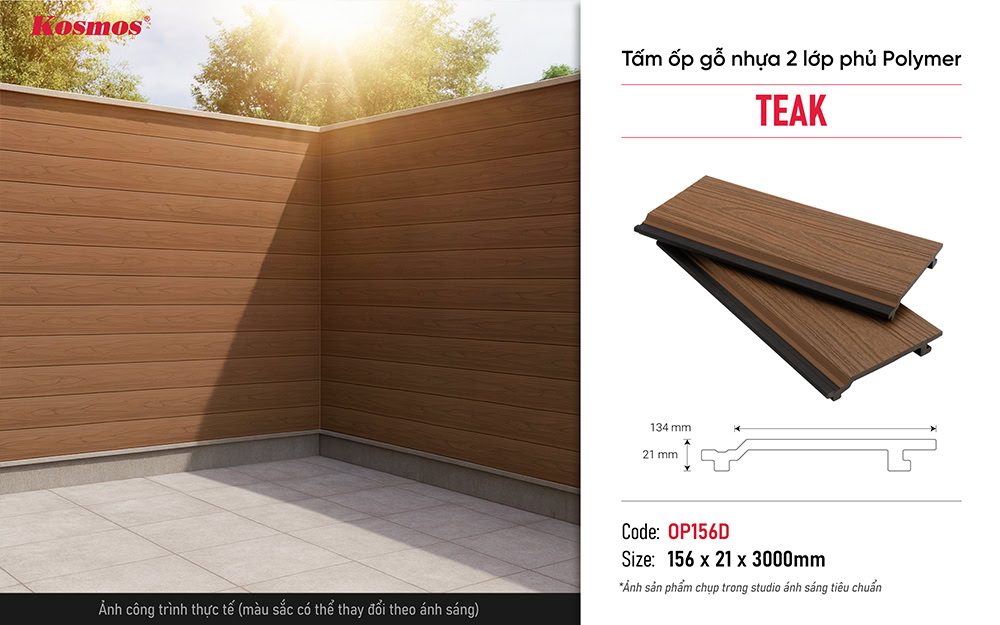 Thông số kỹ thuật cơ bản của tấm ốp gỗ nhựa ngoài trời 2 lớp phủ Polymer OP156D Teak