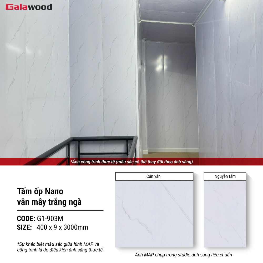 Sản phẩm này có màu sắc vân mây trắng, tạo ra một vẻ đẹp tinh tế và sang trọng cho không gian sử dụng. Với cấu tạo từ PVC và các chất khác như CaCO3, titanium dioxide, phụ gia, tấm ốp Nano Galawood G1-903M có độ bền cao và khả năng chống chịu tác động từ môi trường bên ngoài.