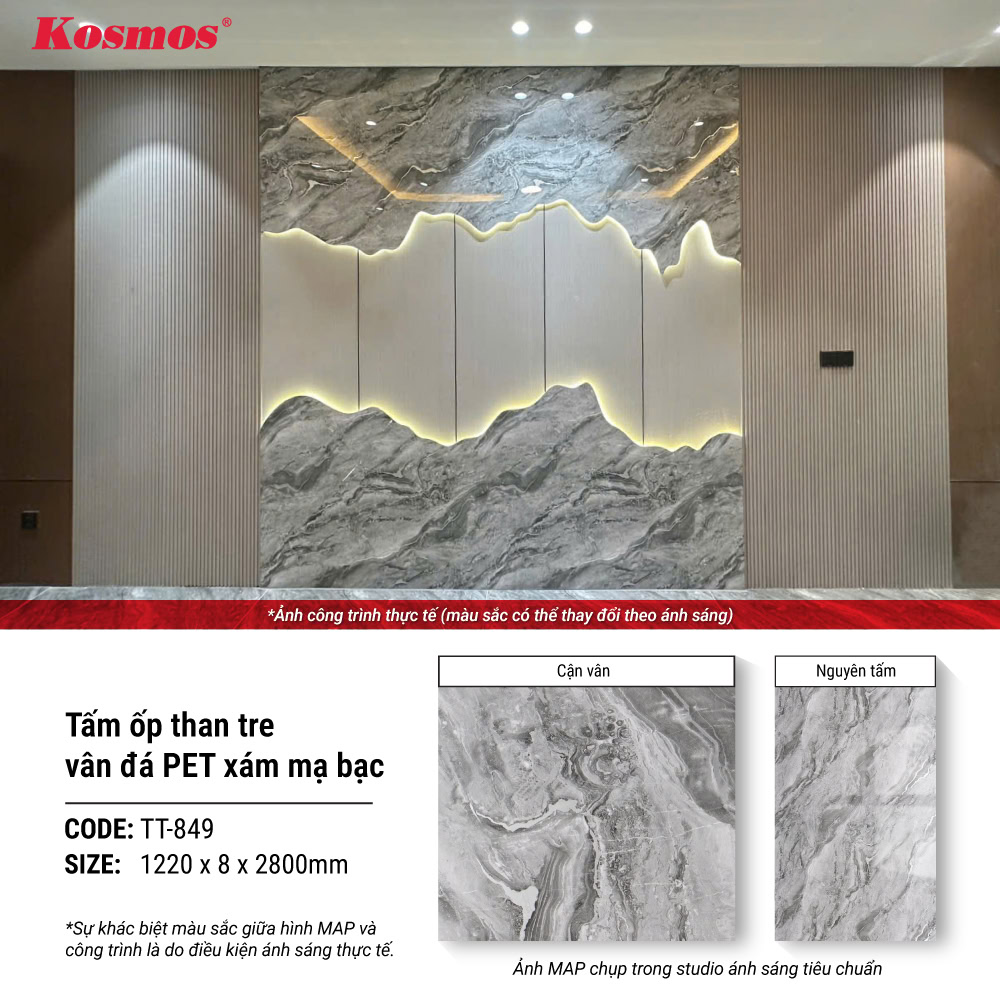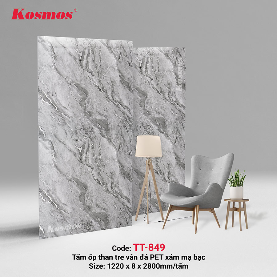 TT-849 vân đá PET dát bạc là dòng tấm ốp tường/trần nội thất thuộc bộ sản phẩm than tre vân đá thương hiệu Kosmos. Nổi bật với thiết kế vân đá phủ PET tinh xảo, mô phỏng chân thực đá dát bạc, sản phẩm mang đến vẻ đẹp sang trọng và hiện đại cho mọi không gian.
