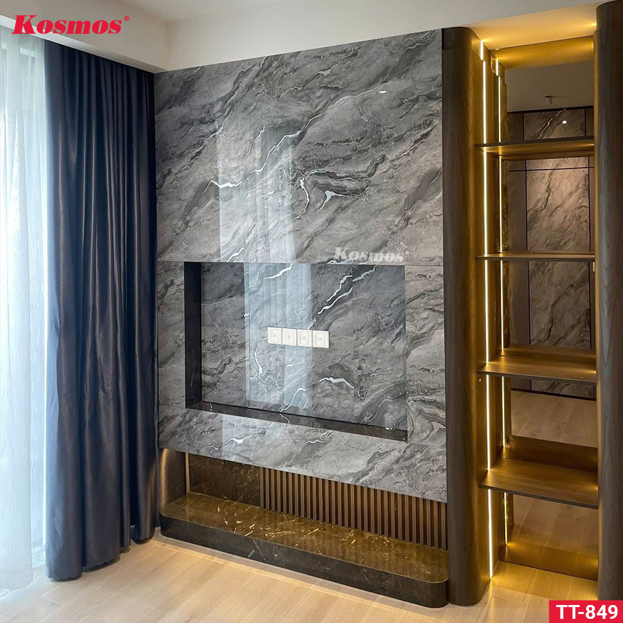 Tấm ốp tường/ốp trần than tre TT-849 của Kosmos mang đến vẻ đẹp sang trọng như đá tự nhiên, tái hiện chân thực từng đường vân, màu sắc của đá. Yếu tố này giúp cho không gian nội thất trở nên lộng lẫy, đẳng cấp và thể hiện gu thẩm mỹ tinh tế của gia chủ, mang đến những trải nghiệm thị giác đầy ấn tượng cho người xem.