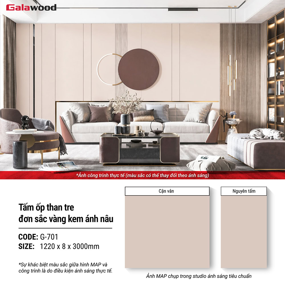 Tấm ốp than tre đơn sắc vàng kem ánh nâu G-701 là dòng vật liệu chuyên dùng để ốp trực tiếp lên các hệ tường và trần nhà. Sản phẩm giải quyết các vấn đề đau đầu như tường bị thấm mốc, nứt nẻ hay lớp sơn bả xỉn màu theo thời gian. Việc ứng dụng tấm ốp này mang lại lợi ích kép: vừa cung cấp một giải pháp thi công siêu tốc, không đập phá, không gây bụi mịn ô nhiễm, vừa nâng tầm đẳng cấp thẩm mỹ cho không gian sống.