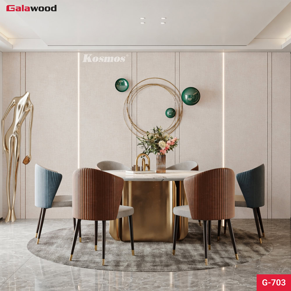 Mã màu G-703 (Vân vải vàng kem) được phát triển để cung cấp giải pháp cho những không gian mang cảm giác lạnh lẽo hoặc thiếu sự gắn kết. Việc sử dụng vật liệu có bề mặt họa tiết vân vải, mô phỏng những sợi dệt đan xen giúp làm mềm các đường nét kiến trúc cứng nhắc. Sắc vàng kem mang lại một dải màu ấm, giúp hấp thụ và phản xạ ánh sáng đèn nội thất một cách dịu nhẹ, không gây chói mắt.