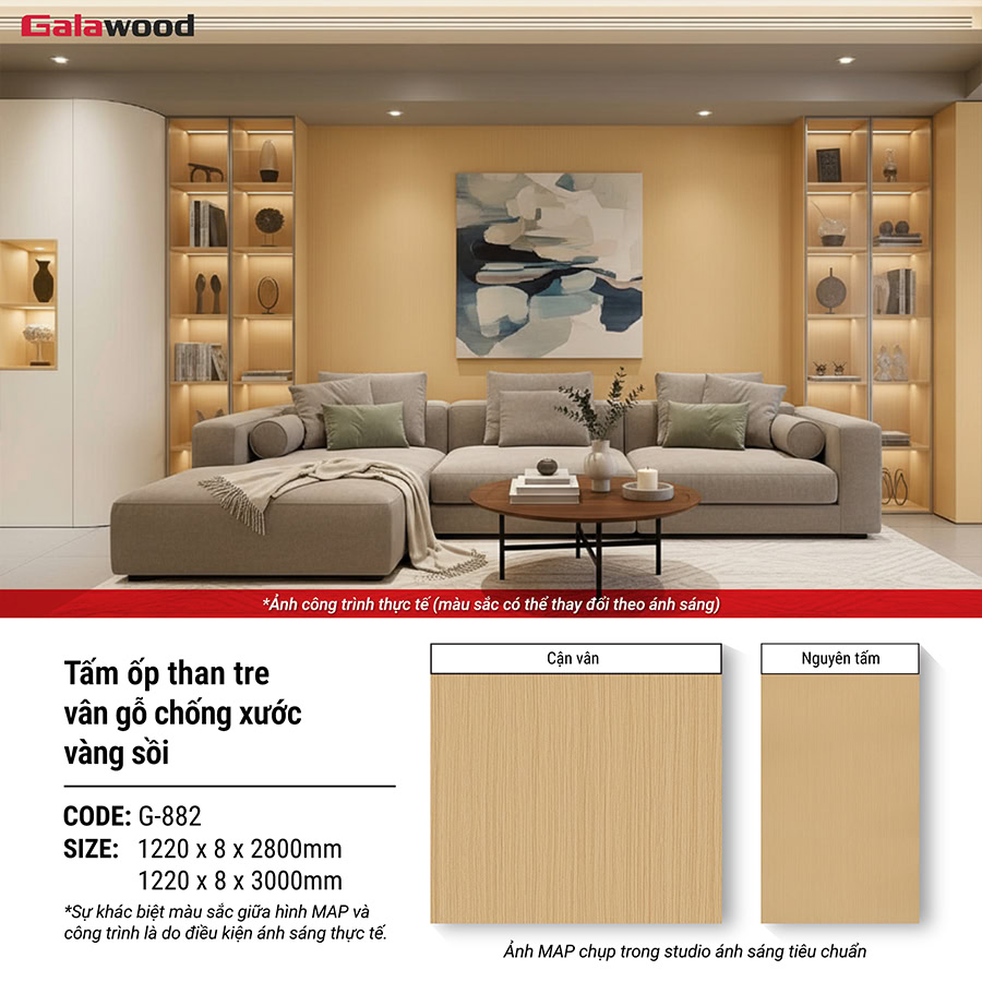 Tấm ốp than tre vân gỗ vàng sồi G-882 Galawood là sản phẩm ốp tường, ốp trần cao cấp với vẻ đẹp giống gỗ tự nhiên nhưng khắc phục được các nhược điểm của gỗ như mối mọt, cong vênh, trương nở.