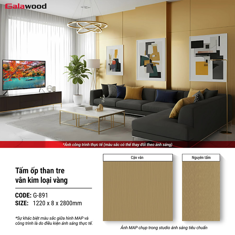 Tấm ốp than tre vân kim loại xước vàng G-891 có thể kết hợp hài hòa với các tấm than tre khác như: