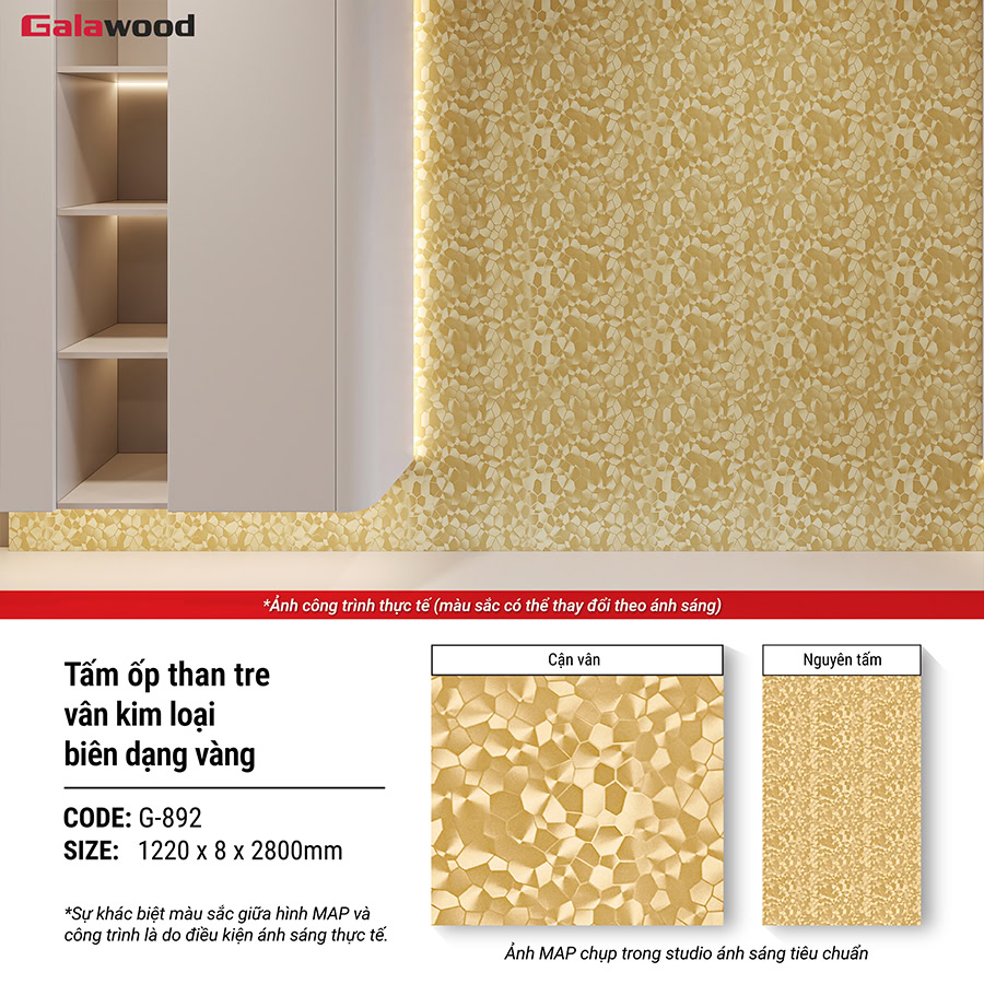 Tấm ốp than tre G-892 vân kim loại biên dạng lục giác phẳng vàng có thể kết hợp tốt với các tấm than tre vân gỗ hoặc vân tráng gương. Việc kết hợp này không chỉ tạo ra sự hài hòa về màu sắc, mà còn giúp nâng cao tính thẩm mỹ cho không gian của bạn.