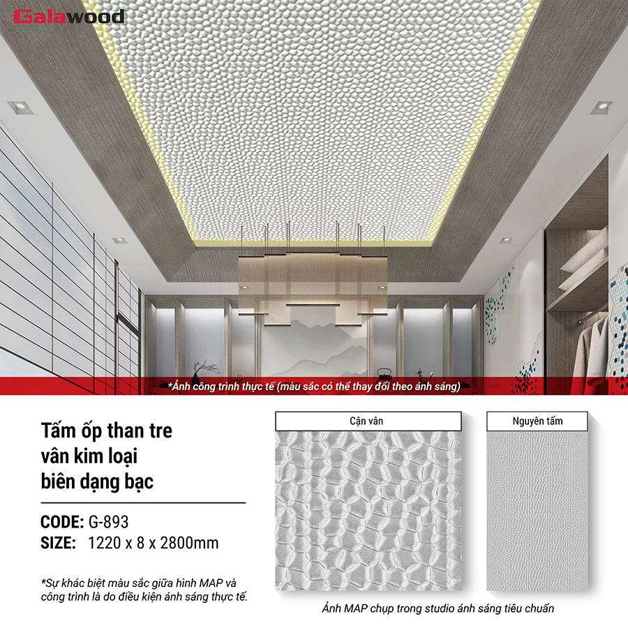 Tấm ốp than tre Galawood vân kim loại biên dạng lục giác lõm bạc G-893 là một sản phẩm nổi bật và được ưa chuộng trên thị trường vật liệu nội thất hiện nay. Với thiết kế độc đáo, màu sắc sang trọng cùng những ưu điểm vượt trội, tấm ốp G-893 mang đến vẻ đẹp hiện đại, tinh tế cho mọi không gian sống.