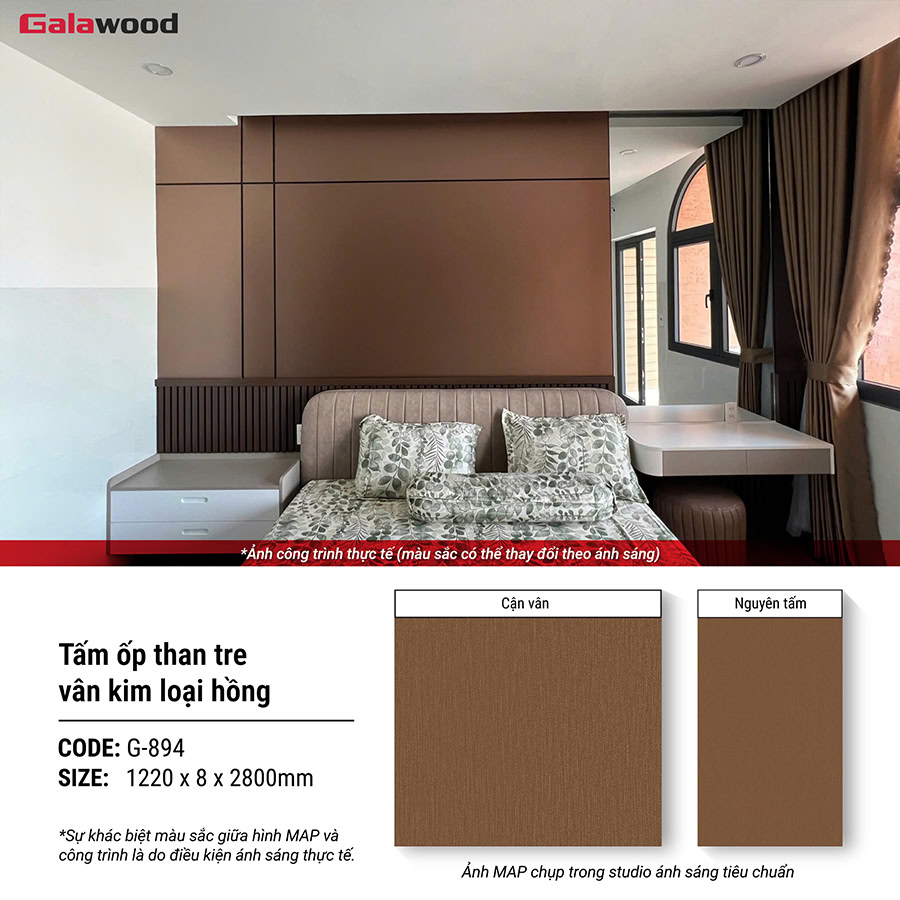 Tấm ốp than tre vân kim loại hồng trà xước dọc G-894 thuộc dòng sản phẩm vân kim loại, có màu hồng trà đặc trưng. Sản phẩm có kích thước tiêu chuẩn 2800 x 1220mm, độ dày 8mm, quy cách 3.416m²/tấm và trọng lượng khoảng 17kg/tấm (sai số tiêu chuẩn ±10%). Dưới đây là các tiêu chuẩn cơ bản của tấm ốp G-894.