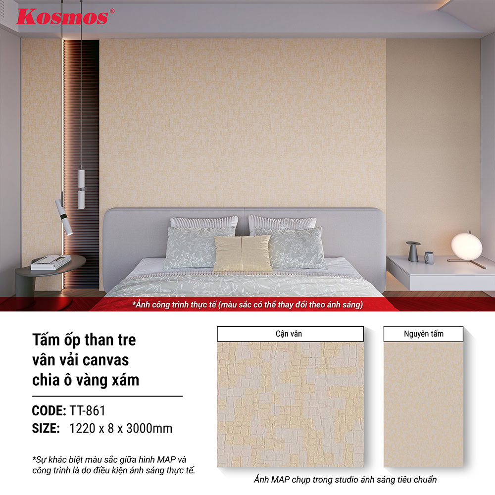 Điểm nhấn của tấm ốp than tre TT-861 đến từ thiết kế bề mặt. Sản phẩm sở hữu một bề mặt vân vải canvas, tạo cảm giác như vải thật nhưng thực chất lại là một bề mặt cứng cáp, chống xước và cực kỳ bền bỉ. Nhờ thiết kế chia ô màu vàng và xám xen kẽ, một sự kết hợp màu sắc đương đại, tấm ốp mang lại vẻ đẹp thanh lịch, sang trọng và không kém phần cá tính cho mọi bức tường.
