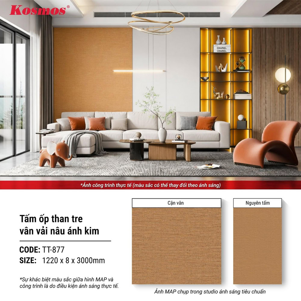 Nhìn chung, tấm ốp than tre Kosmos TT-877 vân vải nâu ánh kim, mang lại cảm giác tinh tế cho các không gian nội thất theo phong cách hiện đại, đương đại hoặc tối giản. Bên cạnh yếu tố thẩm mỹ, cấu tạo nhiều lớp cùng bề mặt chống xước giúp sản phẩm duy trì độ ổn định trong quá trình sử dụng lâu dài.