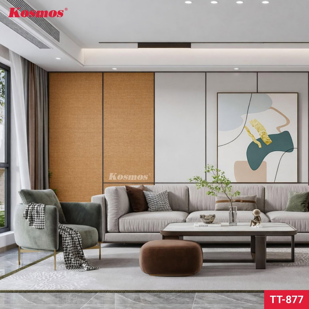 - Contemporary Style (Phong cách đương đại): Vân vải của TT-877 mang lại hiệu ứng gần gũi với vật liệu mềm như vải dệt, giúp không gian trông ấm và có chiều sâu hơn. Trong các phòng khách hoặc phòng làm việc mang phong cách đương đại, tấm ốp vân vải có thể được sử dụng để tạo mảng tường phía sau sofa, tường trang trí hoặc tường TV.