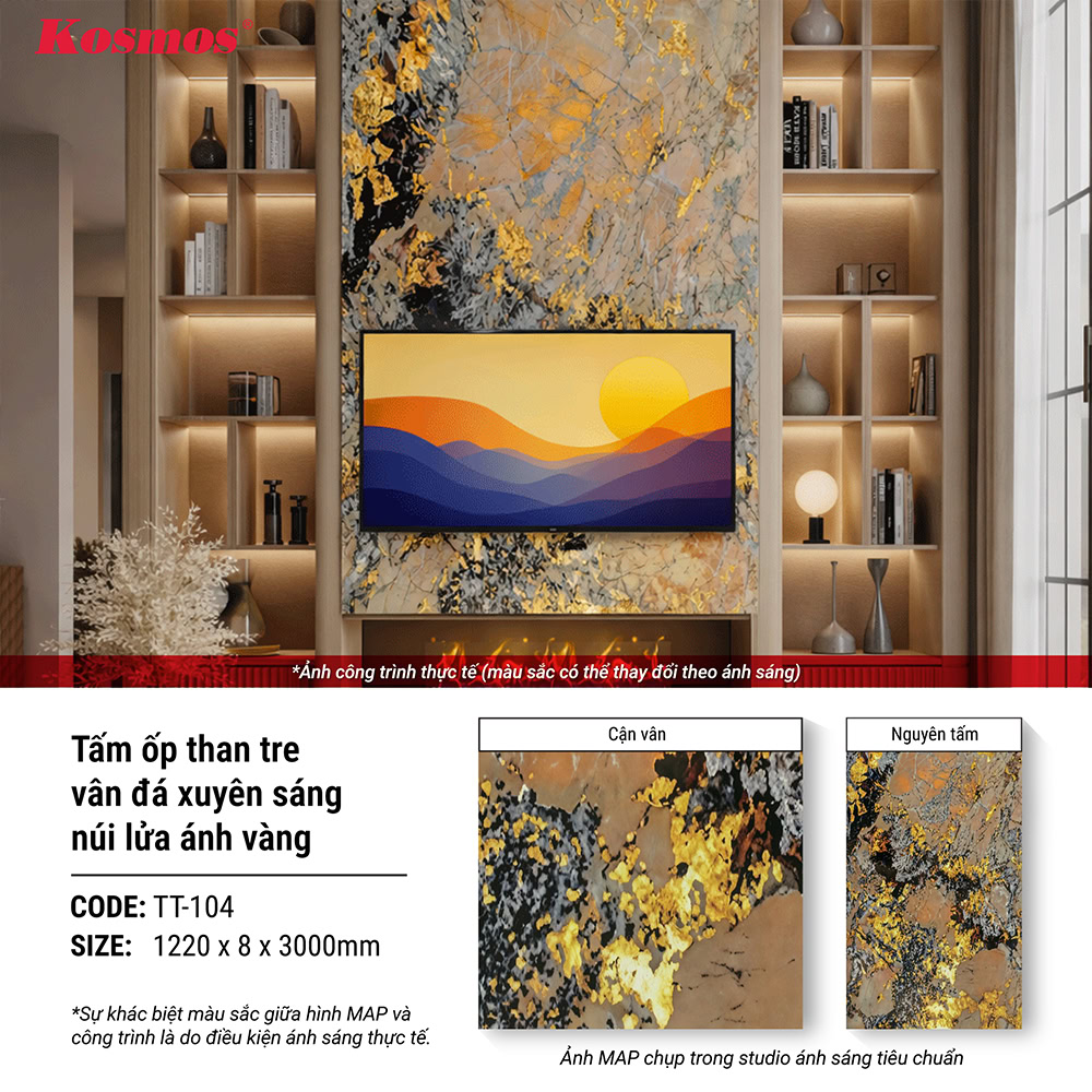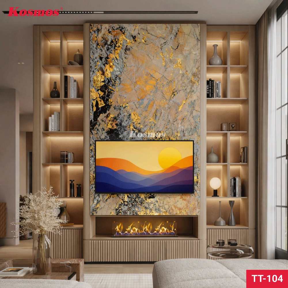 Mẫu vân đá xuyên sáng núi lửa ánh vàng TT-104, giá trị nổi bật nhất là khả năng tạo trọng tâm cho không gian. Nếu chọn đúng vị trí và phối đúng vật liệu đi kèm, TT-104 có thể giúp cả căn phòng nhìn khác đi chỉ từ một mảng ốp chính. Đó là lý do mã này đặc biệt phù hợp với nhóm khách hàng muốn không gian có bản sắc rõ nhưng không muốn phụ thuộc vào quá nhiều chi tiết trang trí rời.