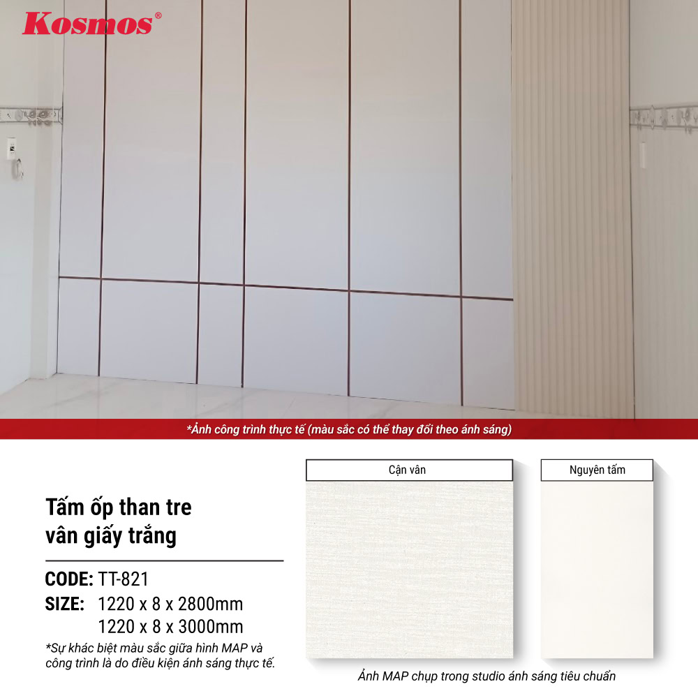 Tấm ốp than tre vân giấy trắng Kosmos TT-821 có độ dày tiêu chuẩn là 8mm, chiều rộng 1220mm, chiều dài 2800mm và 3000mm, cùng 18 thông số nổi bật sau:
