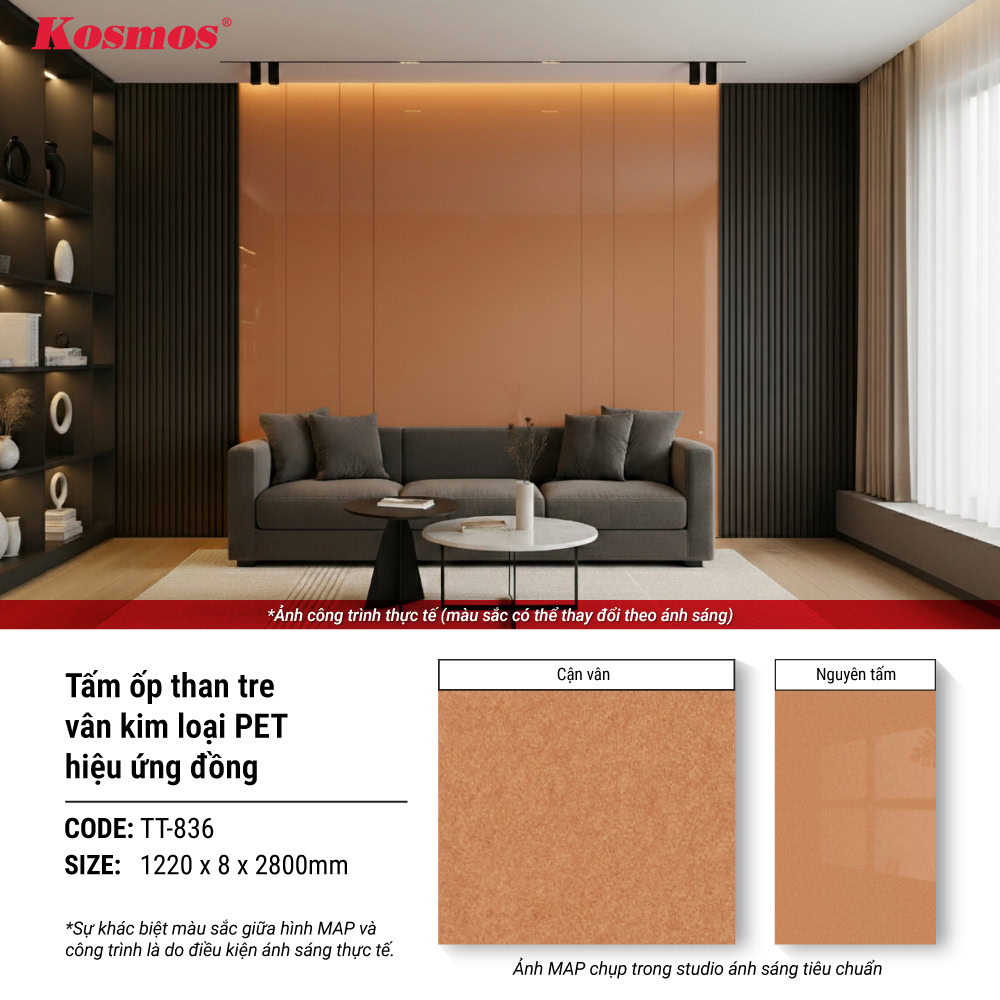 Tấm ốp sợi than tre vân kim loại PET TT-836 thuộc loại tấm ốp kim loại với màu đỏ đồng sang trọng. Sản phẩm sở hữu các đặc tính ưu việt như bề mặt siêu bóng, khả năng chống xước và chống ẩm hiệu quả. Kích thước tiêu chuẩn của tấm ốp là 2800 x 1220mm với độ dày 8mm với trọng lượng khoảng 18kg/tấm.