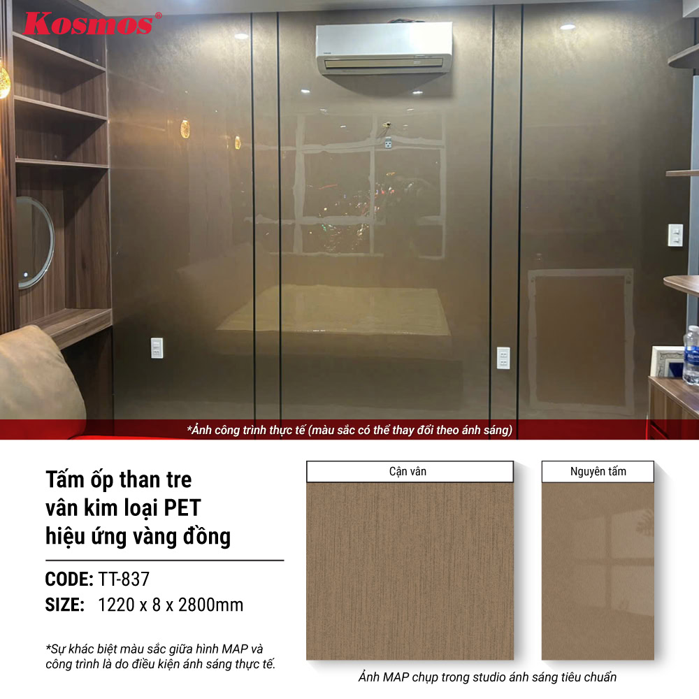 5. Ứng dụng tấm ốp than tre Kosmos vân kim loại PET hiệu ứng xước vàng đồng TT-837