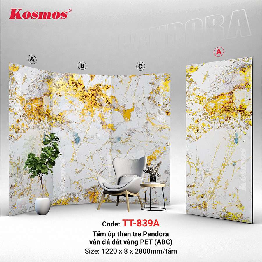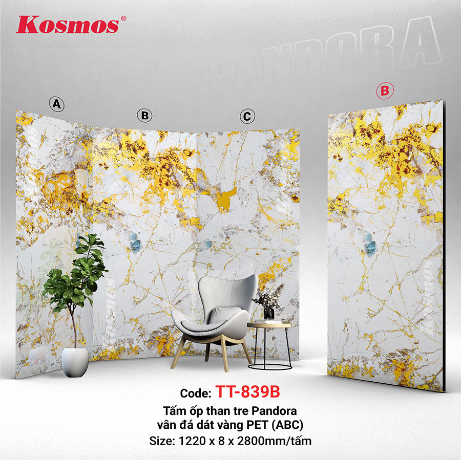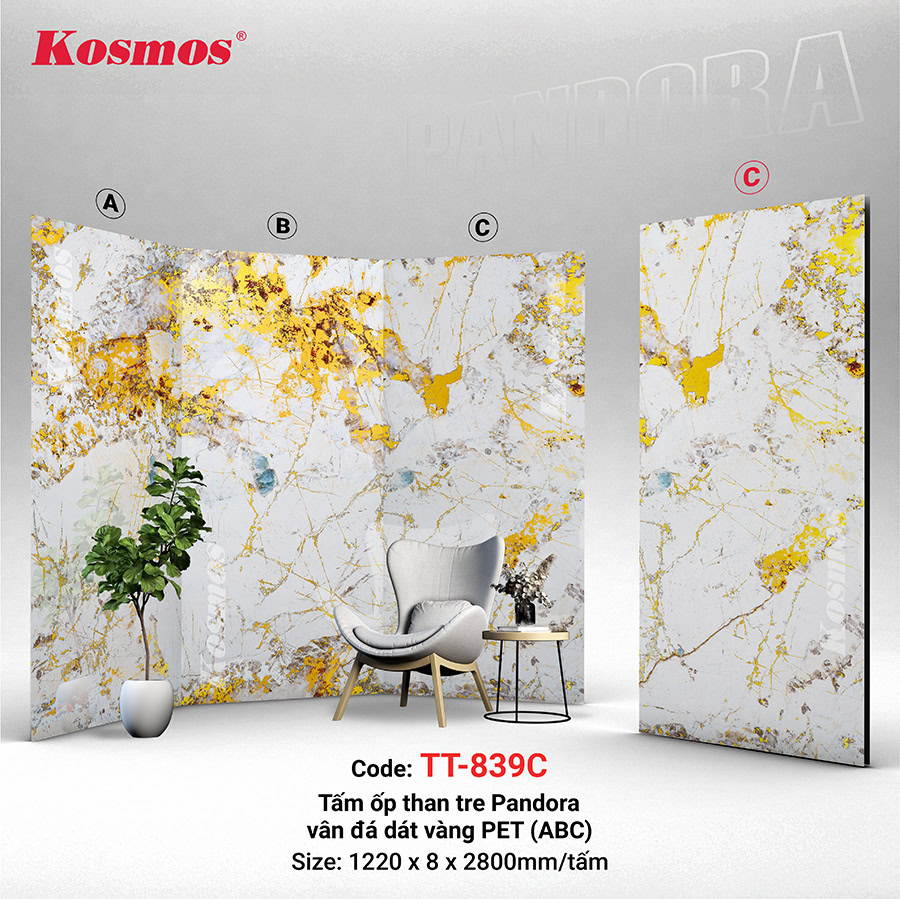 Tấm ốp Pandora than tre liền vân đá dát vàng TT-839 có thể kết hợp với các mẫu than tre đơn sắc, vân gỗ, vân vải, vân kim loại,… của Kosmos để tạo điểm nhấn và sự đa dạng cho không gian.
