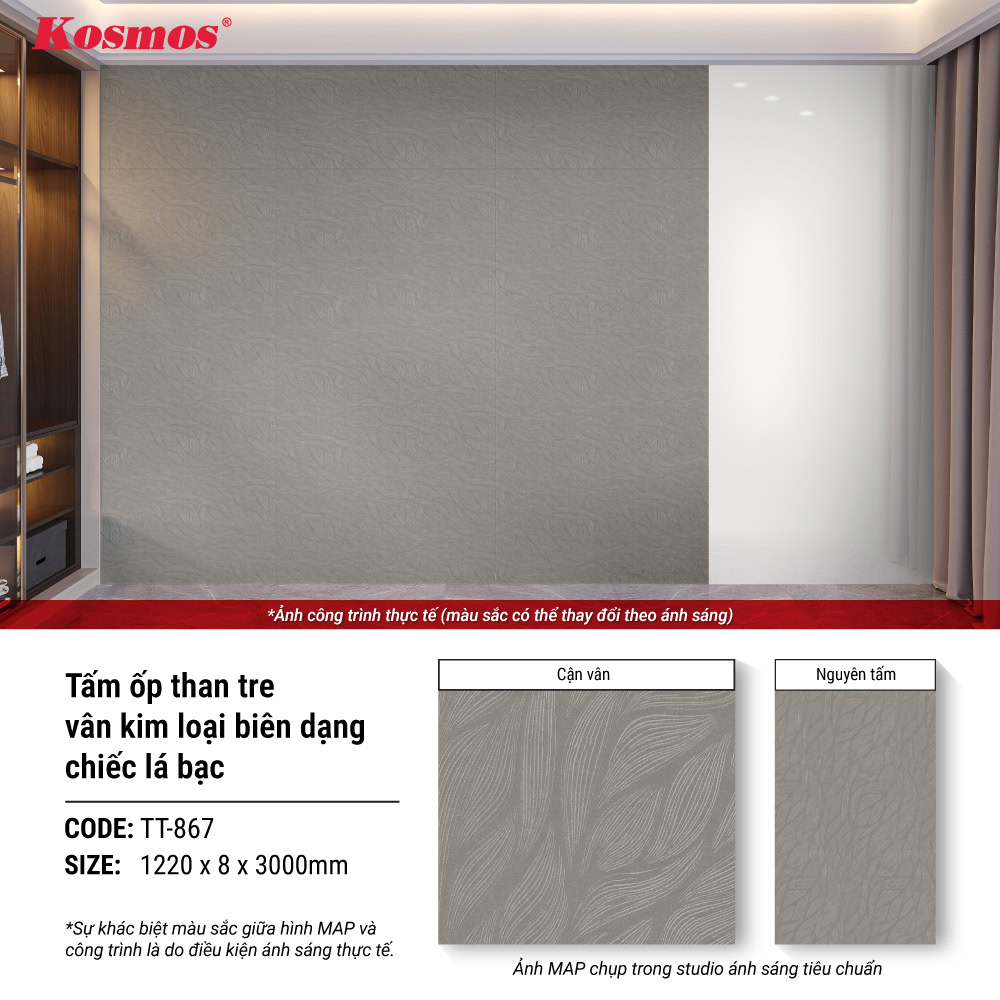 Tấm ốp than tre vân kim loại biên dạng chiếc lá màu bạc TT-867 là giải pháp trang trí nội thất hiện đại, bền vững và kinh tế. Với thiết kế họa tiết chiếc lá độc đáo, công nghệ 4 lớp tiên tiến và khả năng thi công linh hoạt, sản phẩm đáp ứng hoàn hảo nhu cầu nâng cấp không gian sống với chi phí hợp lý và độ bền 15 năm. Đây là lựa chọn lý tưởng cho những ai muốn có không gian sang trọng với ngân sách tối ưu. Kosmos sẵn sàng tư vấn thêm về sản phẩm cho Quý khách qua hotline 0932.067.388