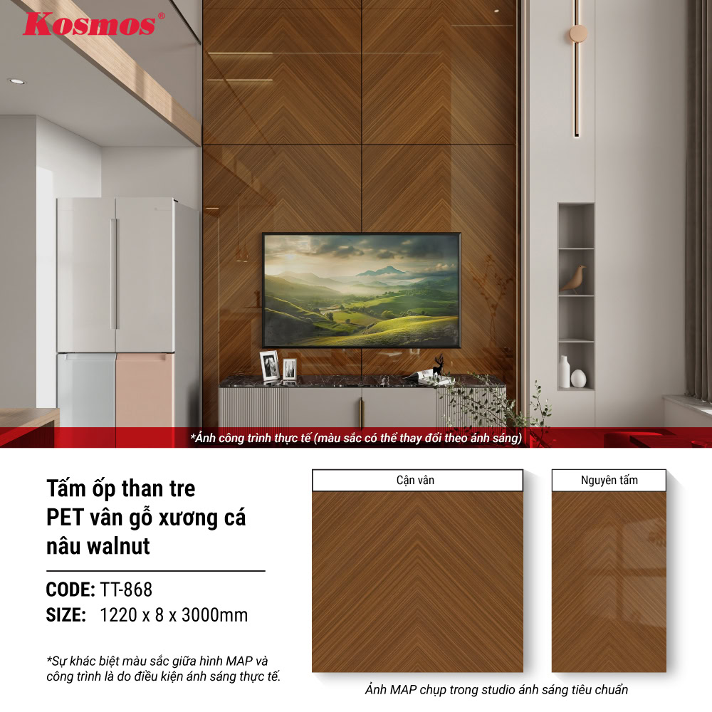 Tấm ốp than tre vân gỗ xương cá phủ PET màu nâu walnut TT-868 là giải pháp trang trí nội thất hoàn hảo kết hợp giữa thẩm mỹ cao, độ bền vượt trội và tính năng an toàn. Với cấu tạo 5 lớp công nghệ cao, đa dạng kiểu lắp đặt và chi phí hợp lý, sản phẩm này đáp ứng mọi nhu cầu thiết kế nội thất hiện đại từ không gian gia đình đến thương mại. Kosmos sẵn sàng tư vấn thêm khi Quý khách có nhu cầu cần giải đáp thắc mắc qua số 0932.067.388.