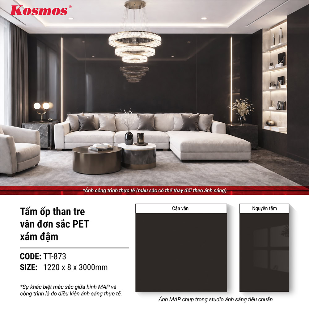 Bên cạnh TT-873 vân đơn sắc PET xám đậm với sắc độ trầm và hiệu ứng bề mặt bóng rõ nét, dòng tấm ốp than tre vân đơn sắc còn có TT-872 vân đơn sắc PET xám nhạt dành cho những không gian cần cảm giác sáng và nhẹ hơn. Hai mã sản phẩm cùng sử dụng lớp phủ PET bóng, giúp bề mặt dễ vệ sinh và giữ được tính thẩm mỹ lâu dài.