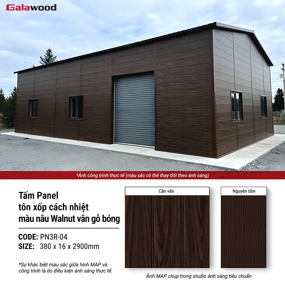 Tấm cách nhiệt 3 lớp PN3R-04 với thiết kế 3 rãnh vân gỗ nâu walnut bề mặt bóng là giải pháp cách nhiệt hiện đại, kết hợp hoàn hảo giữa hiệu suất cách nhiệt tốt và tính thẩm mỹ cao, đáp ứng nhu cầu xây dựng bền vững với tuổi thọ lên đến 20 năm và khả năng không rỉ sét trong 45 năm.