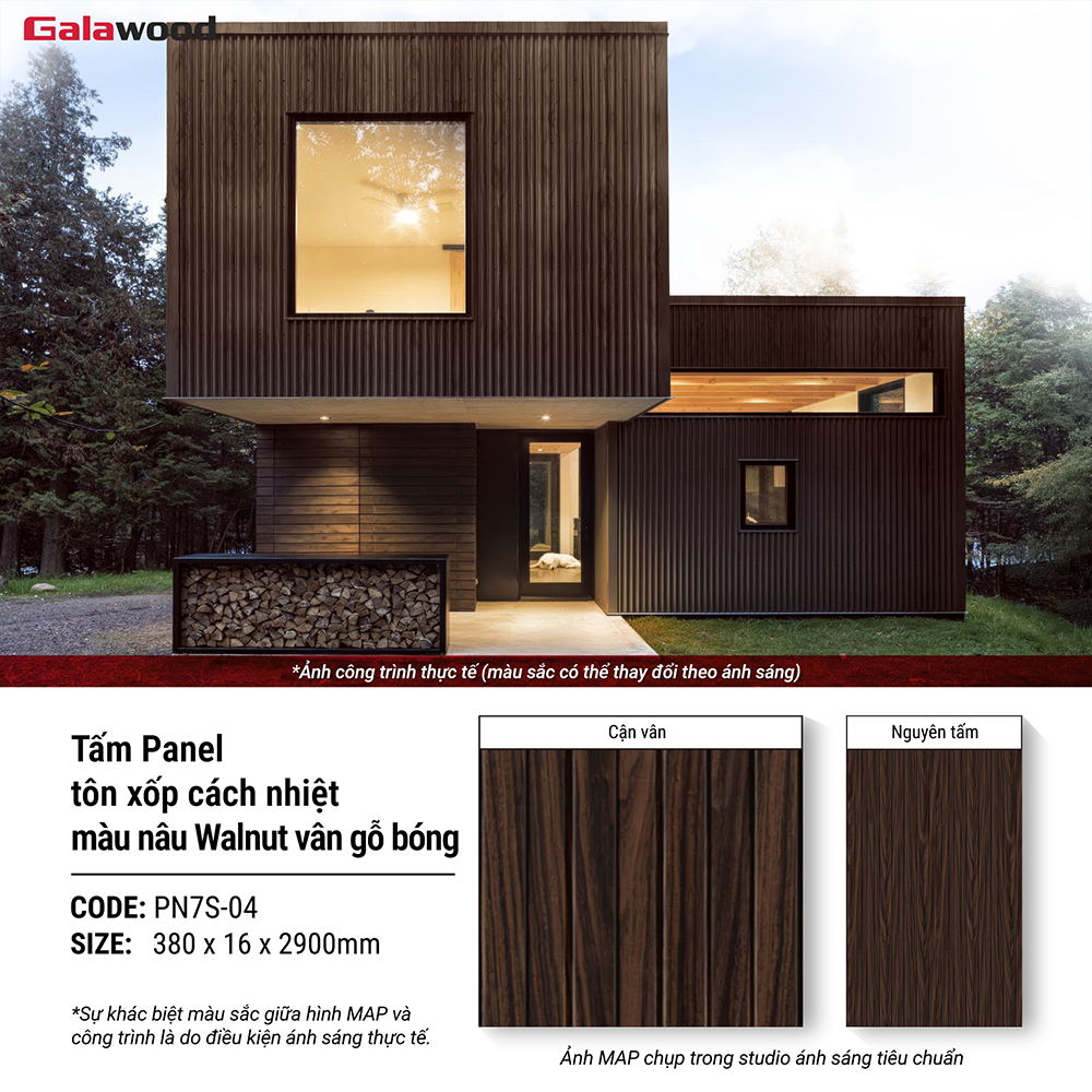 Tấm Panel cách nhiệt ngoài trời PN7S-04 sở hữu thiết kế 7 sóng màu nâu walnut – bề mặt bóng ấn tượng cùng nhiều tính năng ưu việt, là lựa chọn phù hợp cho các công trình ngoài trời hiện nay.