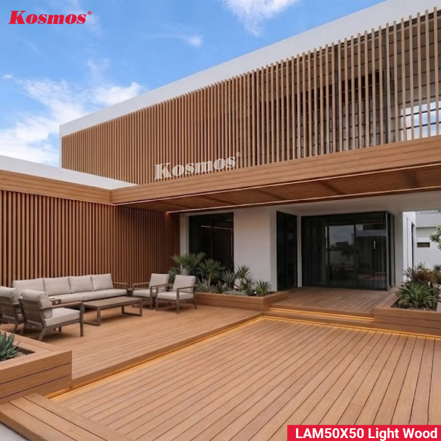- Tính thẩm mỹ cao, chân thật: Màu gỗ vàng cam ở thanh lam LAM50X50 giúp các hạng mục ngoại thất trở nên rực rỡ và trẻ trung hơn, đặc biệt phù hợp với các thiết kế gần gũi thiên nhiên hoặc phong cách kiến trúc nhiệt đới. Bề mặt vân nhám mịn giúp giảm thiểu độ bóng của nhựa, tạo cảm giác như những thanh gỗ tự nhiên.