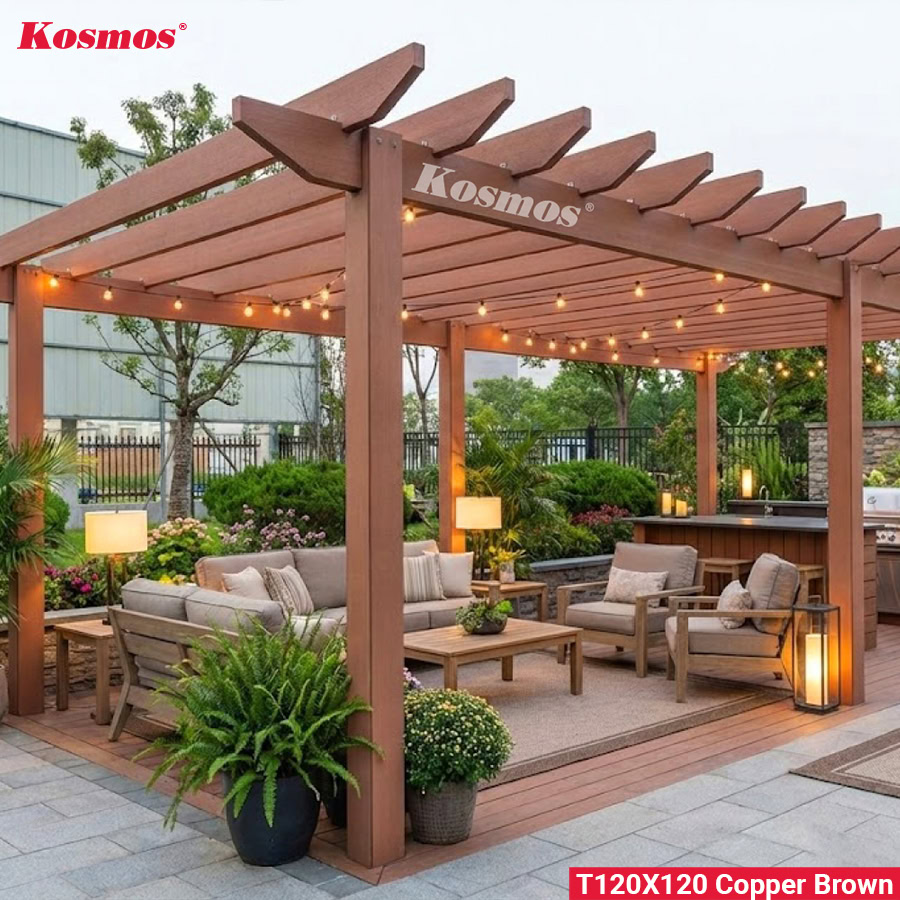 Trụ gỗ nhựa 1 lớp Kosmos T120×120 màu nâu đỏ là dòng vật liệu WPC (Wood Plastic Composite) dạng cột vuông, được thiết kế chuyên dụng cho các hạng mục trang trí ngoại thất như giàn hoa pergola, trụ hào rào, lan can. Sản phẩm đáp ứng cả yêu cầu về thẩm mỹ và độ ổn định khi sử dụng trong điều kiện khắc nghiệt ngoài trời.