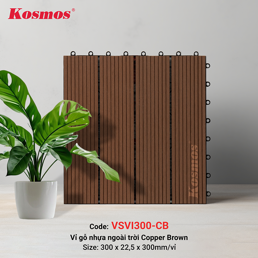 Vỉ gỗ nhựa VSVI300 Kosmos màu Copper Brown (nâu đỏ) là sản phẩm lát sàn ngoài trời cao cấp với kích thước 300x300mm, bảo hành 3 năm và tuổi thọ 10 năm. Sản phẩm thuộc dòng WPC (Wood Plastic Composite) được thiết kế chuyên dụng cho không gian ngoại thất.