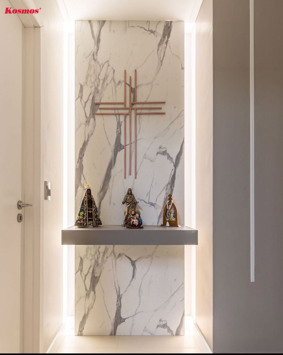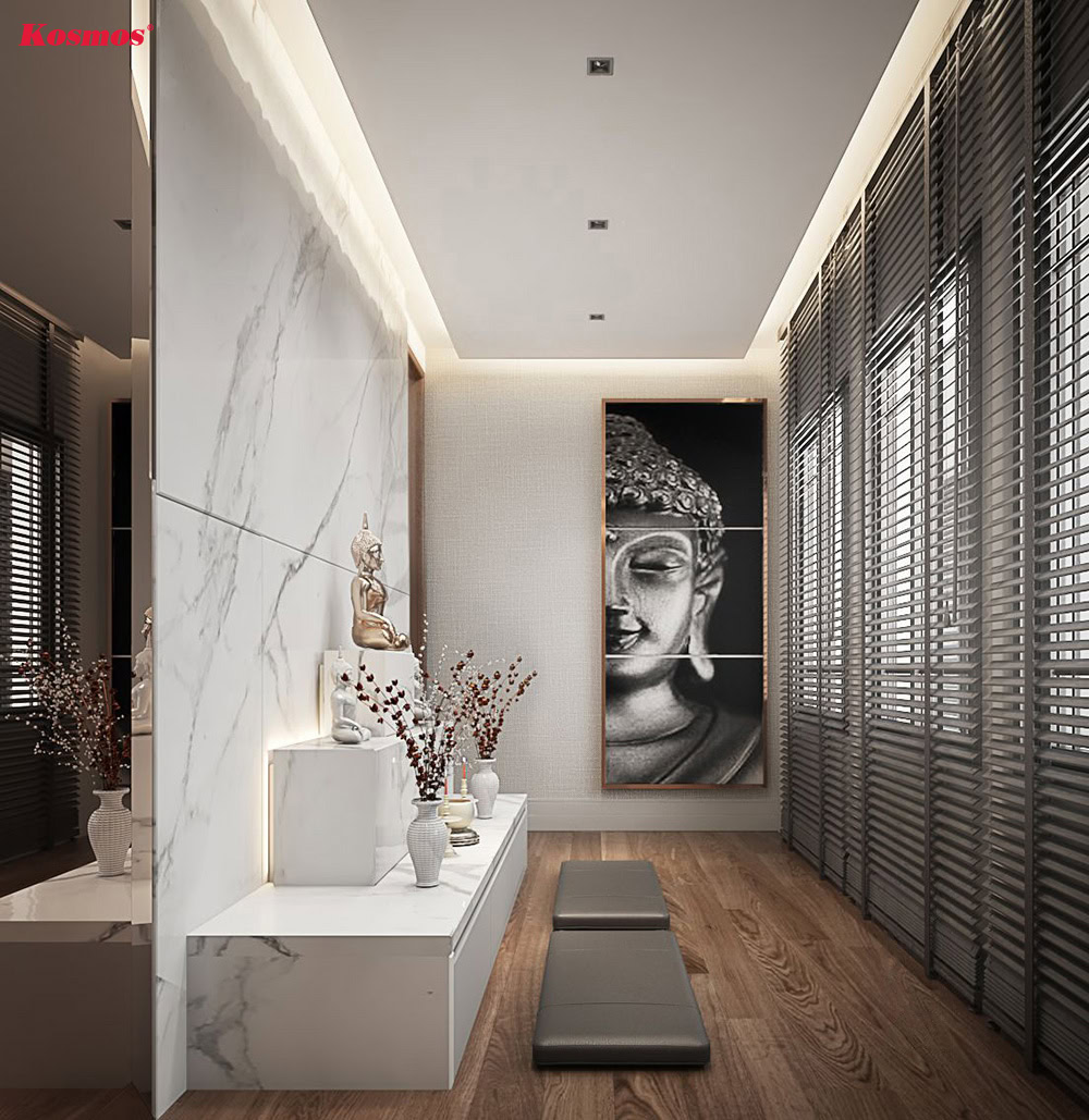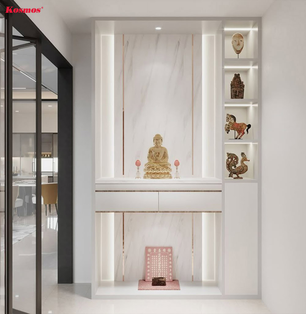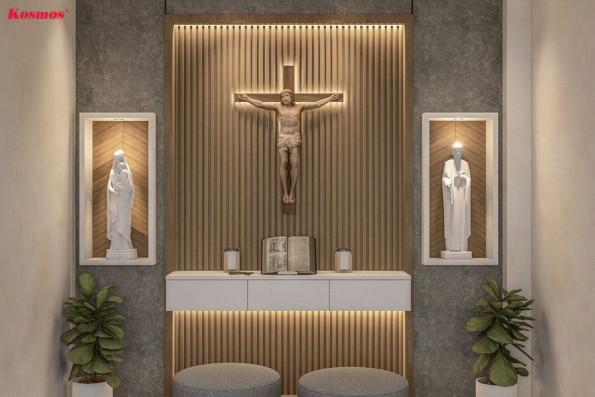 Các dòng vật liệu nổi bật như tấm ốp PVC vân đá, tấm ốp than tre, tấm ốp nhựa được Kosmos phân phối đều sở hữu ưu điểm vượt trội: Bền chắc, chống ẩm mốc, dễ dàng vệ sinh và có tính thẩm mỹ cao. Nhờ mẫu mã phong phú cùng khả năng ứng dụng linh hoạt, các sản phẩm này đảm bảo giúp không gian phòng thờ thêm trang nghiêm, tinh tế và đáp ứng tiêu chuẩn phong thủy.