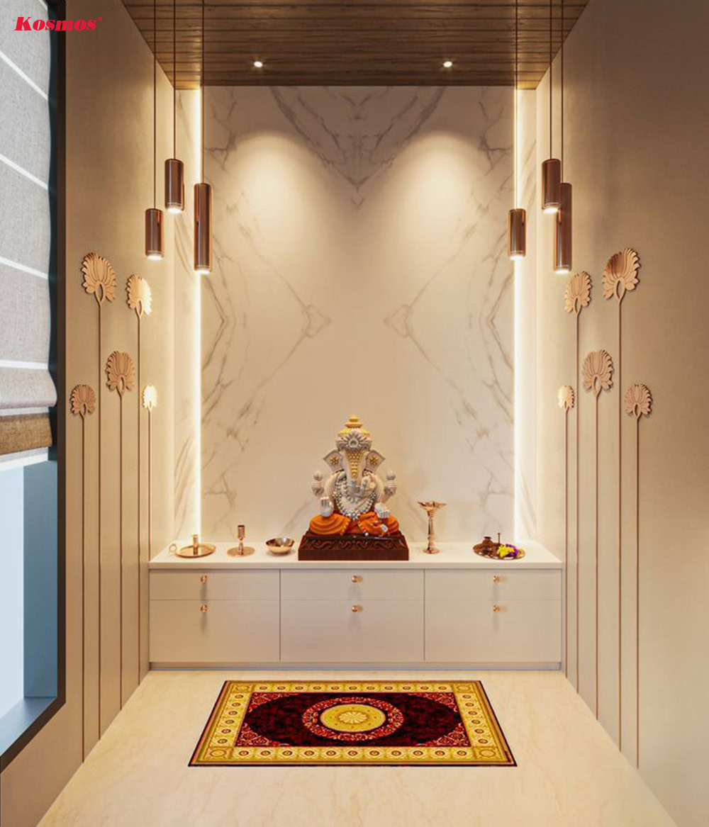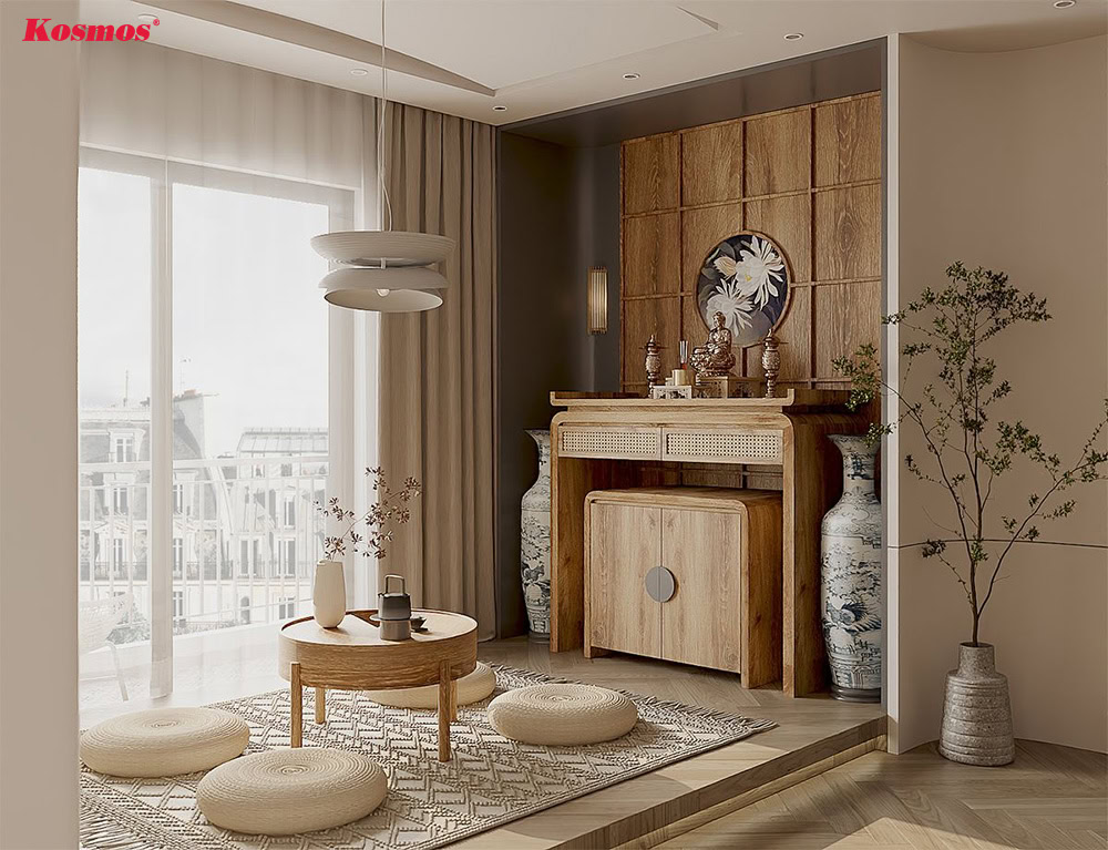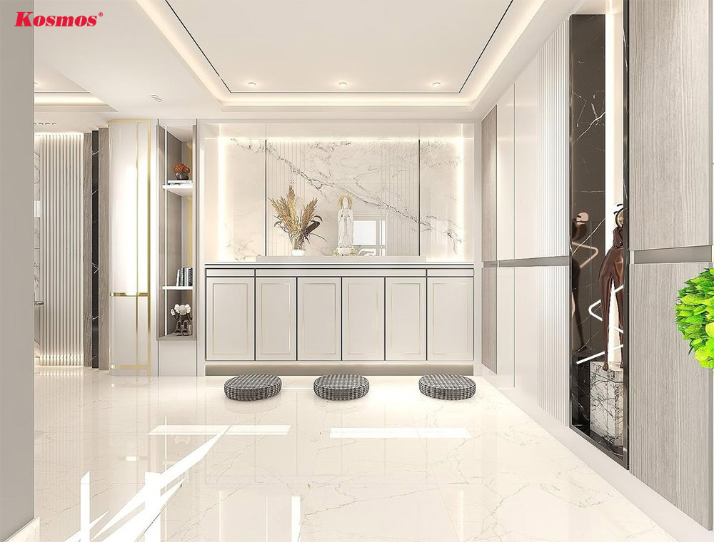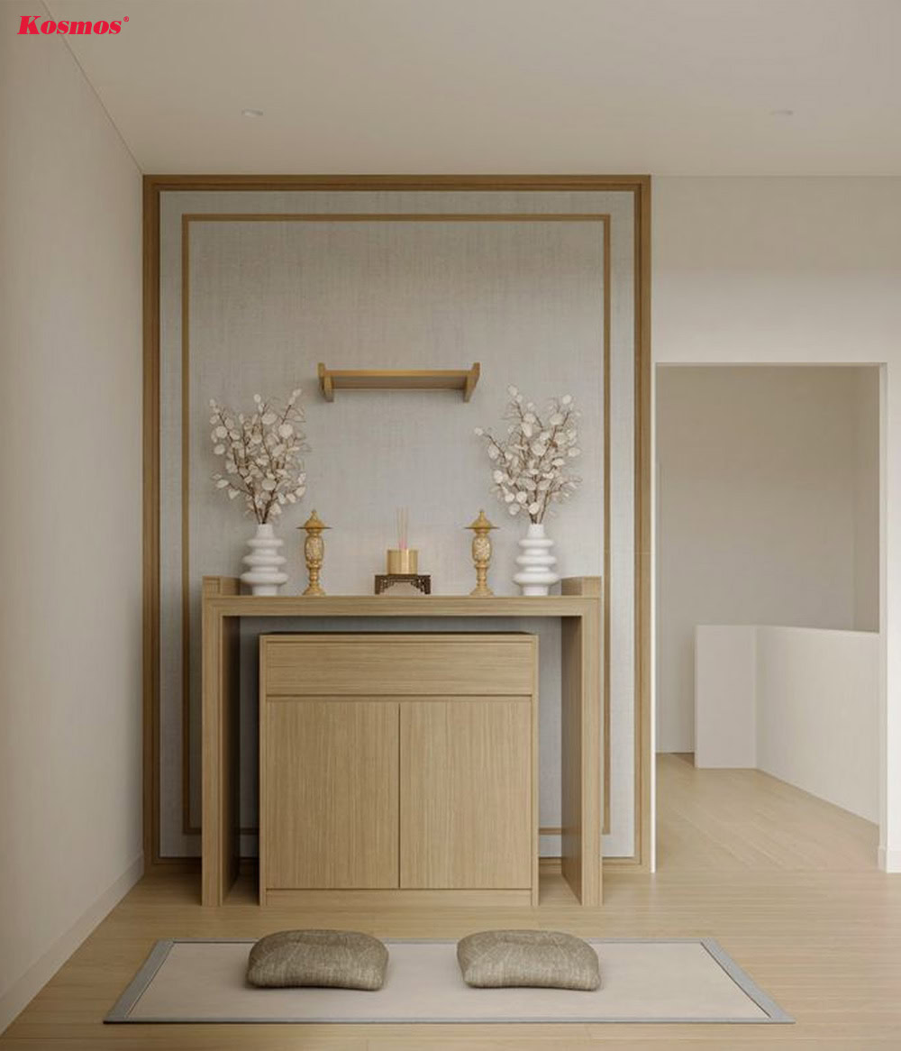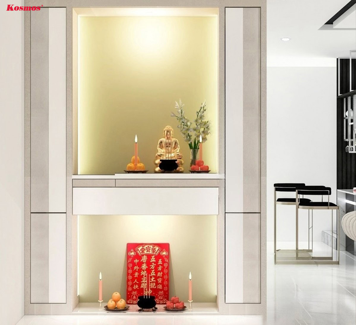Các dòng vật liệu nổi bật như tấm ốp PVC vân đá, tấm ốp than tre, tấm ốp nhựa được Kosmos phân phối đều sở hữu ưu điểm vượt trội: Bền chắc, chống ẩm mốc, dễ dàng vệ sinh và có tính thẩm mỹ cao. Nhờ mẫu mã phong phú cùng khả năng ứng dụng linh hoạt, các sản phẩm này đảm bảo giúp không gian phòng thờ thêm trang nghiêm, tinh tế và đáp ứng tiêu chuẩn phong thủy.