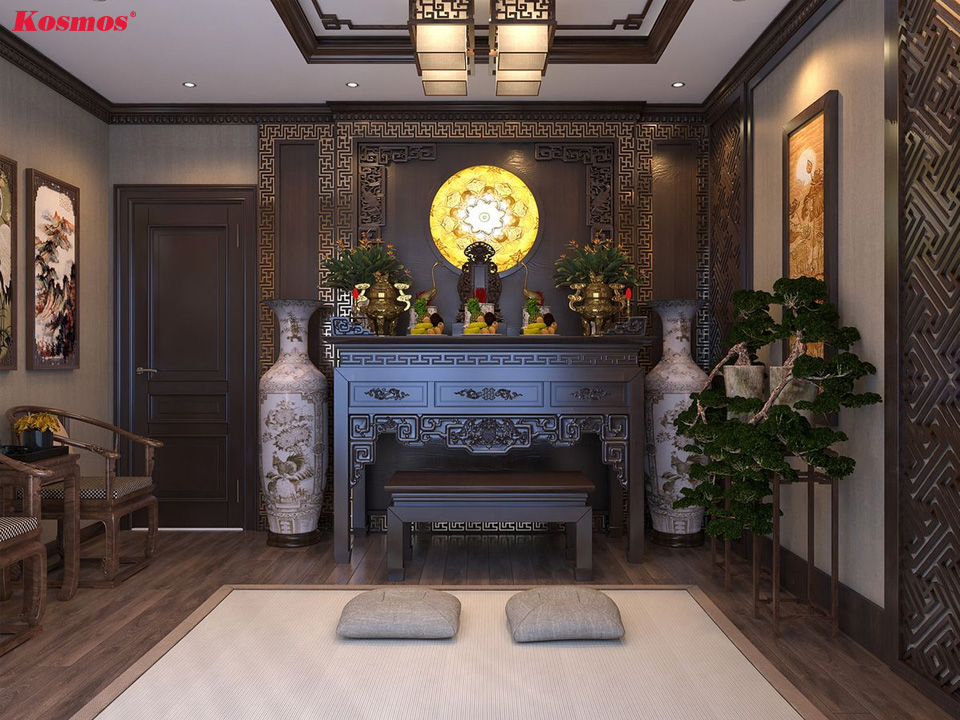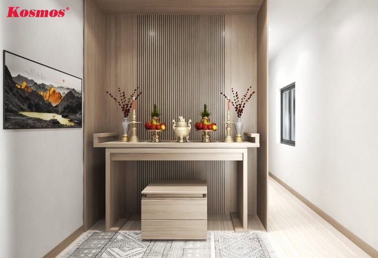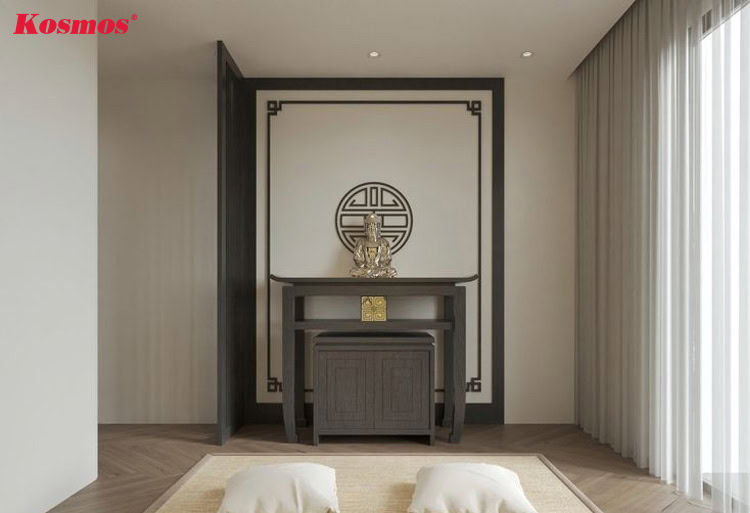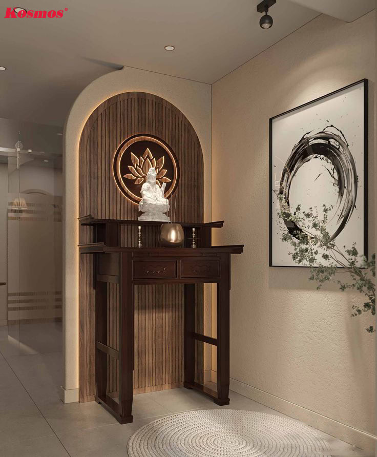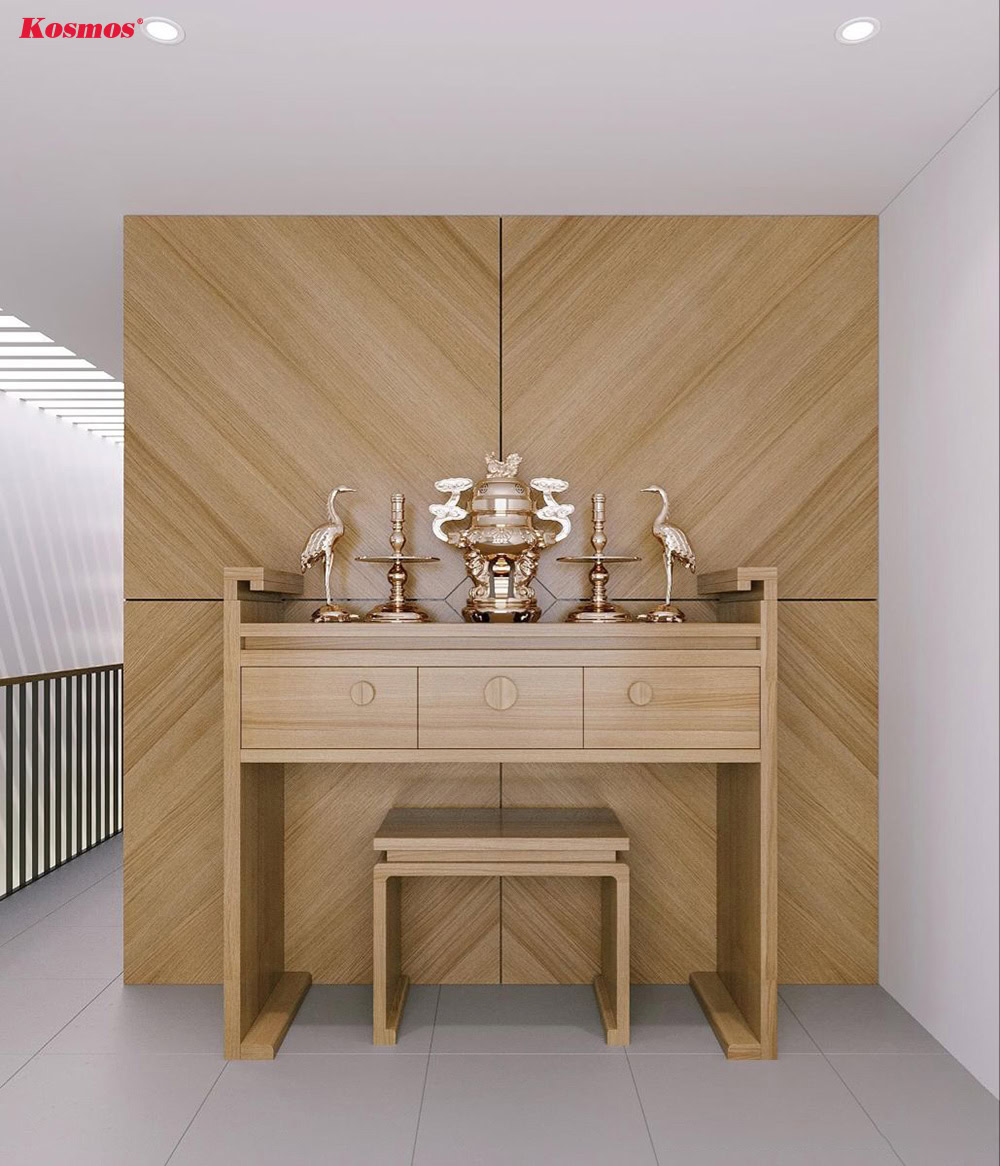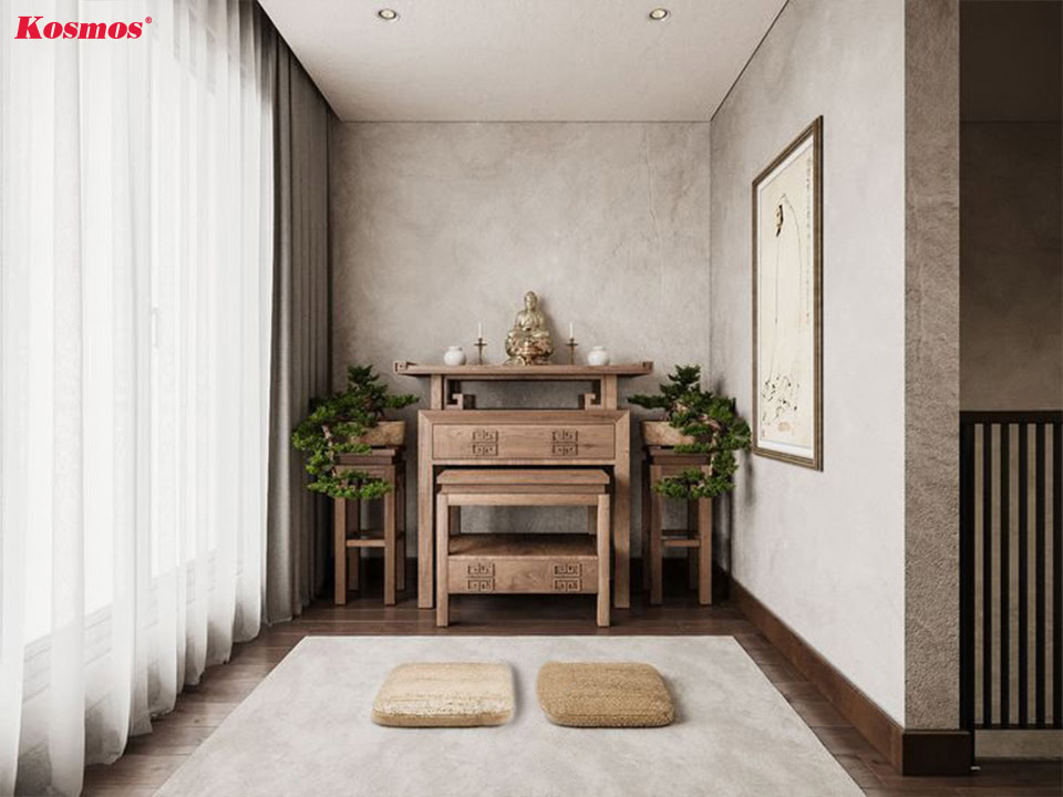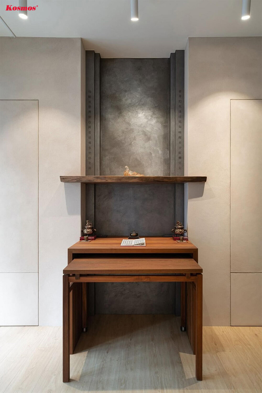 - Quan tâm đến màu sắc: Nên lựa chọn tông màu trầm ấm, trung tính hoặc giả gỗ, giả đá, vừa tạo cảm giác trang nghiêm vừa thuận theo phong thủy. Tránh những màu quá rực rỡ hoặc lệch tông với tổng thể căn nhà.
