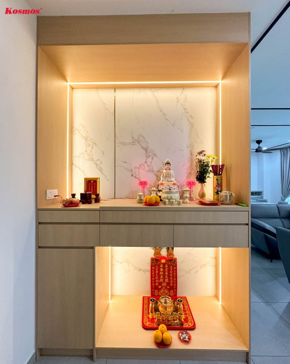 - Đảm bảo yếu tố phong thủy: Khi lựa chọn, gia chủ nên ưu tiên gam màu trầm ấm, vân gỗ hoặc vân đá để giữ sự tôn nghiêm và cân bằng năng lượng trong phòng thờ. Việc chọn màu hợp mệnh không chỉ mang lại tính thẩm mỹ mà còn giúp gia tăng vượng khí, thu hút may mắn và bình an cho gia đình.