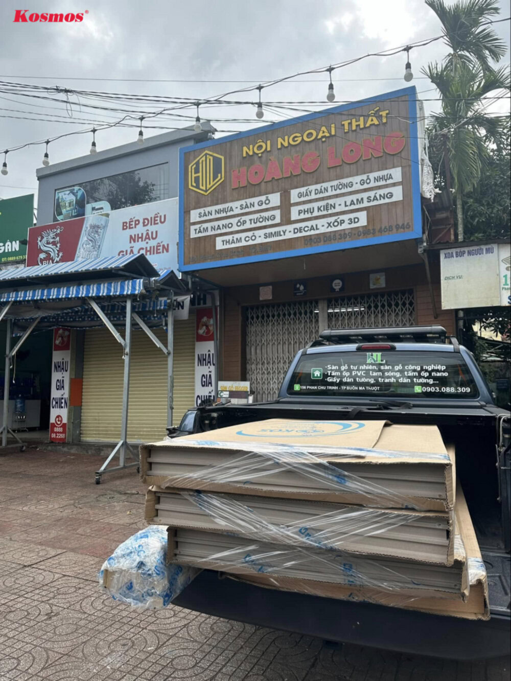Hoàng Long hợp tác với Kosmos từ năm 2019, chuyên phân phối tấm ốp tường PVC, sàn gỗ công nghiệp, sàn nhựa giả gỗ, sàn nhựa chịu lực, vách ngăn nhựa 2 mặt, tấm Panel, tấm ốp than tre. Cửa hàng Hoàng Long BMT nằm tại 156 Phan Chu Trinh, phường Buôn Ma Thuột, tỉnh Đắk Lắk.