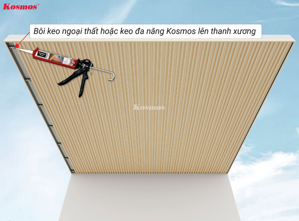 - Bôi keo ngoại thất hoặc keo đa năng lên hệ thanh xương trước khi tiến hành lắp đặt tấm ốp.
