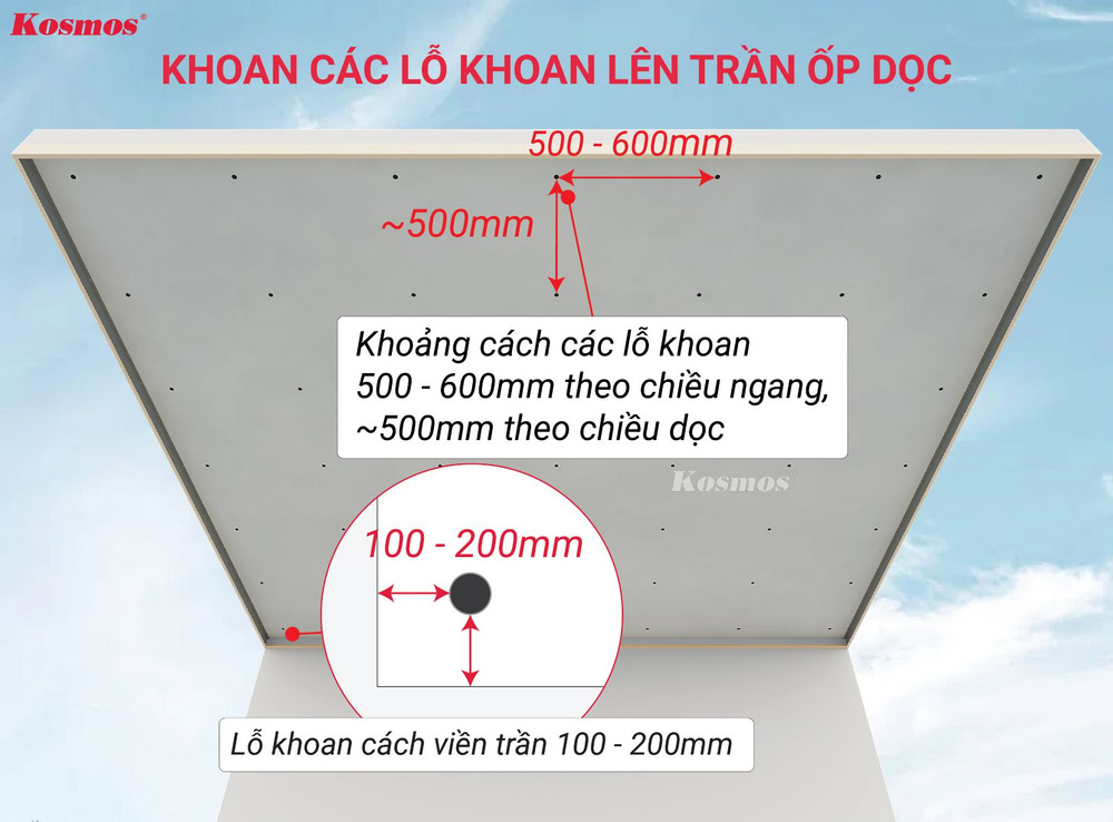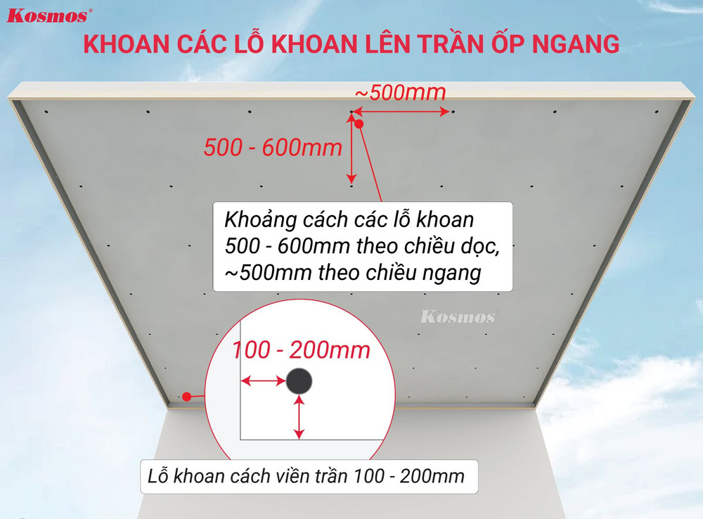 | Ốp trần dọc – Khoảng cách giữa các lỗ khoan ~500mm theo chiều dọc và 500 – 600mm theo chiều ngang. – Lỗ khoan cách viền trần ~100 – 200mm. | Ốp trần ngang – Khoảng cách giữa các lỗ khoan 500 – 600mm theo chiều dọc và ~500mm theo chiều ngang. – Lỗ khoan cách viền trần ~100 – 200mm. |