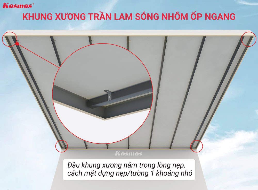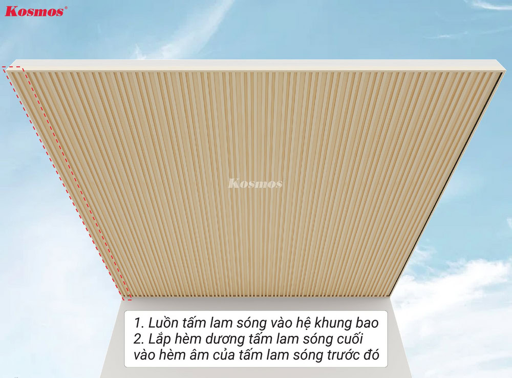 Khi thi công trần ngoài trời, bắt buộc phải lắp đặt trên hệ khung xương cố định và hệ khung bao bằng thanh nẹp U/V. Hệ khung xương sử dụng cho trần lam sóng nhôm nên được gia công từ inox hoặc thép mạ kẽm, với quy cách tối thiểu 25 x 25mm và độ dày từ 1,2mm trở lên để đáp ứng yêu cầu chịu lực và độ bền lâu dài.