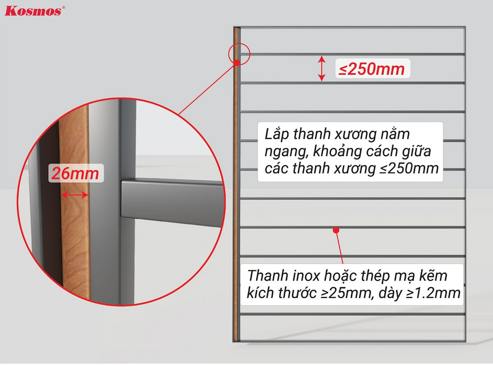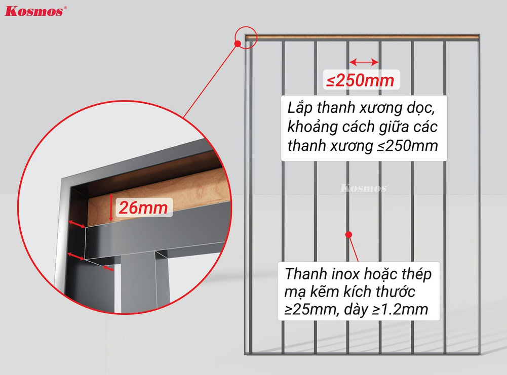 - Thanh xương (thanh inox hoặc thép mạ kẽm) kích thước ≥25x25mm và độ dày ≥1,2mm